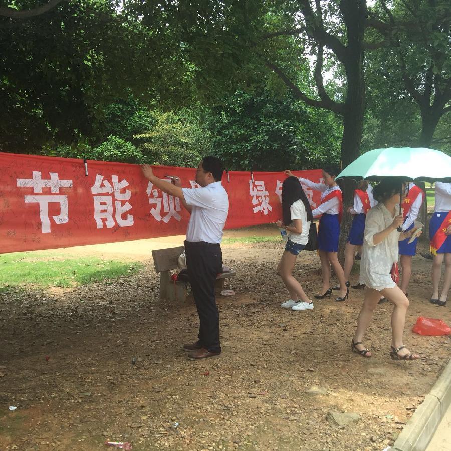 6月14日,全国低碳日。在后勤服务中心联合会计学院举办的大型节能宣传签名活动中,党委书记、校长赵恒伯等一千多名师生在节能宣传的横幅上庄重签下了自己的名字。