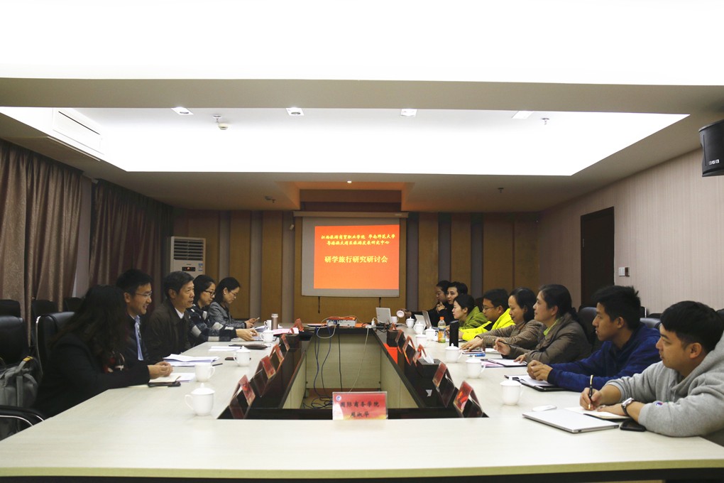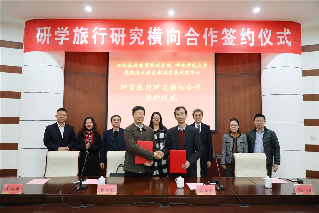 董家彪代表华南师大调研组一行在签约仪式上致辞,对与江西旅游商贸职业学院的成功携手表示祝贺。他指出,研学旅行是当前一大热点,此项目是江西旅游商贸职业学院校领导积极推进、反复研讨的成果,具有非常重要的意义。粤港澳大湾区旅游发展研究中心组建的团队既有理论专家,也有实践专家;而旅游商贸职院从校企合一的建设、研学产品的积累到运行机制的准备,已经具备了良好的基础。双方就合作达成共识,希望旅游发展研究中心课题组能不负学校领导、老师重托,和旅商团队紧密合作,将任务完成好,实现“理论有高度、执行有力度、感情有温度”,争取达成预定目标。董家彪还对研究中心的功能、任务及研究方向作了简要介绍。