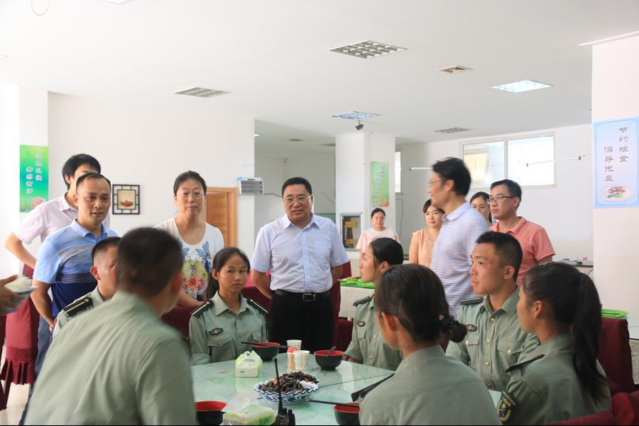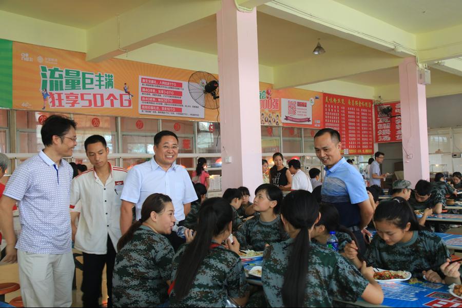 27日,2015级新生军训第一天,上午军训刚一结束,党委书记、校长赵恒伯就在党委委员、校长助理肖长荣等的陪同下,来到学校各个食堂,看望慰问军训新生及教官,关心他们的饮食生活情况。
