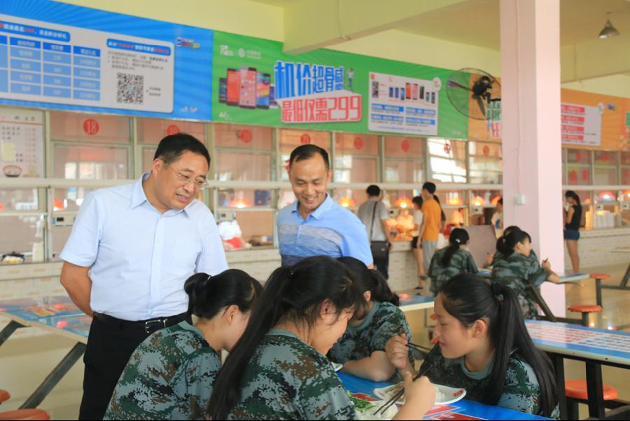 在学校第三食堂,赵恒伯书记走到打饭菜的窗口,仔细察看米饭的质量和菜品的色香味情况,不时询问饭菜的价格,并和正在打饭菜的新生亲切交谈,询问他们来自哪里,吃的是否习惯。看到几个女生正坐在一起吃的津津有味,赵恒伯书记走上前主动和她们打起了招呼,询问他们对饭菜的意见,关心他们军训的情况。看到其中一个女生吃的比较少,赵恒伯书记关切地询问她怎么就吃这么一点点,并开玩笑地对她说不要为了保持身材,就不吃饭,因为军训期间,体力消耗大,要吃饱饭,才能军训好。学校领导父亲式的关切,让几位女生很是感动。