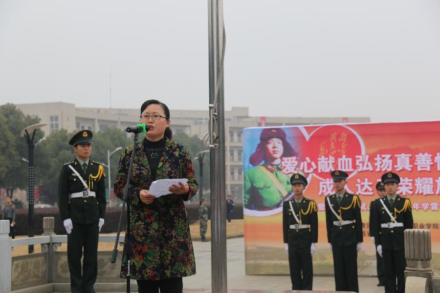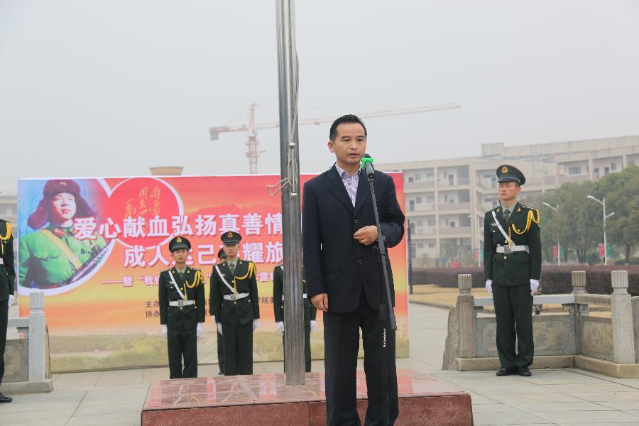 江西省血液中心党委书记李秀珍在仪式上讲话。李秀珍书记代表省血液中心对我校长期致力于无偿献血公益事业的宣传推动表示衷心的感谢,对我校与省血液中心联合开展的志愿服务活动表示肯定。她表示,此次以爱心献血志愿活动来学习雷锋精神,既是雷锋精神的传承,又是践行当代雷锋精神的最好行动。希望同学们以此为契机,积极行动起来,奉献出自己的爱心,用热血筑起爱的长城,让青春永放光彩,让十八岁的天空更加灿烂。