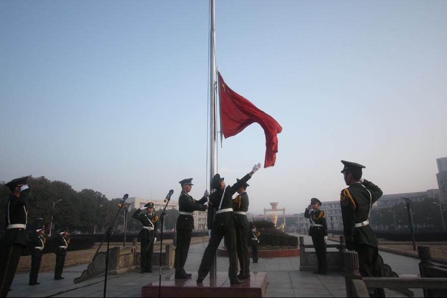 仪式上,举行了庄严的升国旗仪式。国旗护卫队的队员们迈着整齐的步伐,迎着晨曦,护送国旗入场,伴随着激昂雄壮的国歌声,五星红旗冉冉升起,迎风飘扬,全体师生怀着崇敬与喜悦的心情,凝视着迎风飘扬的五星红旗,感受着中国梦的逐步实现,心中无比自豪。