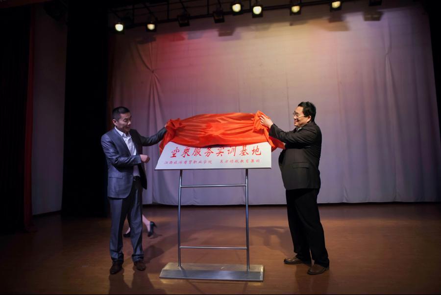 校长赵恒伯与武恒君董事长共同为空乘服务实训基地揭牌