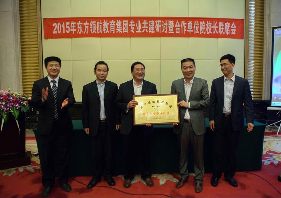 4月26日,东方领航教育集团专业共建合作研讨暨合作单位院校长联席会在南昌召开,东方领航教育集团董事长武恒君、总裁戴晋权,我校党委书记、校长赵恒伯,党委委员、副校长范秀仁,全国近50家东方领航教育集团合作单位院校长参加了会议。会上,我校被东方领航教育集团授予重点战略合作院校,并举行了授牌仪式。