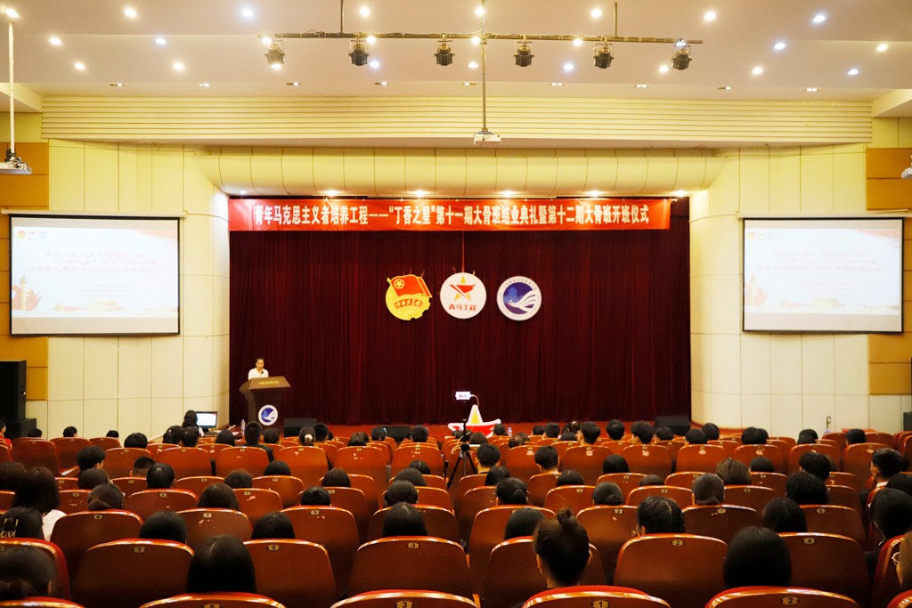 为深入推进“青年马克思主义者培养工程”,让大学生骨干成为合格的马克思主义接班人,进一步加强我校大学生队伍的建设,5月12日下午,学校团委在学术报告厅举行青年马克思主义者培养工程——“丁香之星”第十一期大骨班结业典礼暨第十二期大骨班开班仪式。团委、学生工作部(处)、各二级学院党总支相关负责人、专职团干及第十一期、第十二期全体大骨班学员参加仪式。