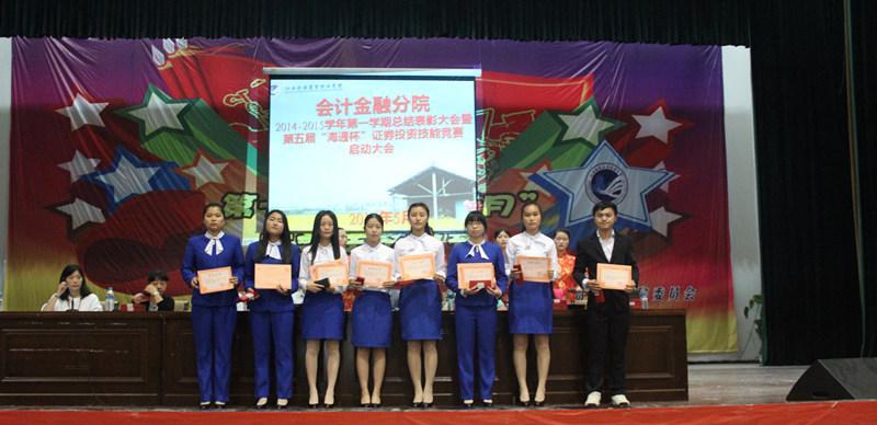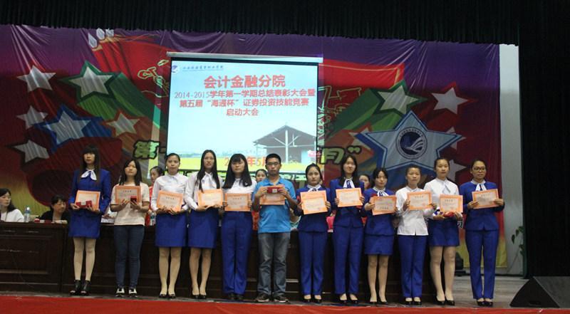 会议总结了上学期分院举办的第十一届技能之星系列竞赛和第四届“海通杯”证券投资竞赛活动情况并对获奖学生进行了表彰。在第十一届技能之星竞赛活动中,共设立了十个竞赛项目,报名参赛人数984人,按照参赛人数2%评选技能之王,8%评选技能之星,此次竞赛共评选技能之王13人,技能之星60人,同一项目连续两期获技能之王的同学,被评为年度技能之王,此次评选年度技能之王3人。第四届“海通杯”证券投资竞赛根据投资业绩评选特等奖1人、一等奖2人、二等奖5人及三等奖10人。会议同时还表彰了2014年度在会计、证券投资、沙盘模拟经营等项目省级以上技能竞赛获得优异成绩的同学。会议同时还启动了第十二届技能之星和第五届“海通杯”证券投资技能竞赛活动。
