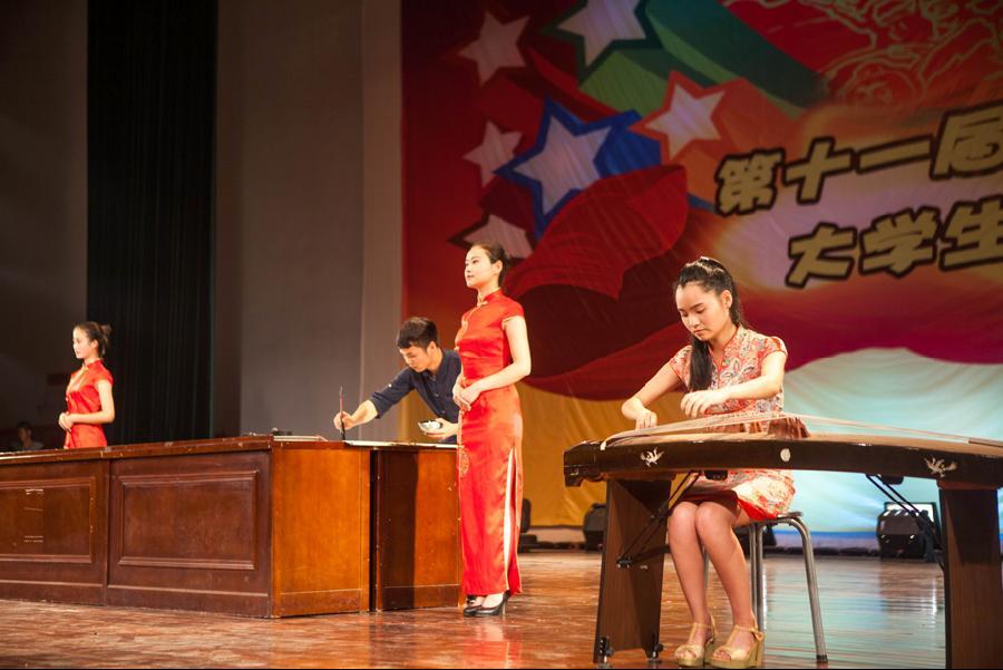 艺术传媒与计算机分院的书画表演《书画青春》充分结合分院的特色,将书法和古筝融合一体,刘健同学行云流水驰走于纸端的毛笔,加上悠扬的古筝伴奏,整个节目将传统艺术和专业技能表现得淋漓尽致,赢得了现场不断的掌声。