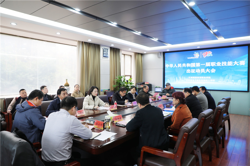 为积极备战中华人民共和国第一届职业技能大赛,在全国赛场上充分展现我校学生专业技能和综合素养,鼓舞全体参赛师生树立起坚定的信念和高昂的斗志,12月3日下午,学校组织代表江西省参加4个世赛选拔赛和3个国赛精选赛的竞赛项目成员在行政楼三楼会议室召开赛前出征动员大会,党委书记吴小平,党委副书记、院长蔡海生,党委委员、副院长杨福盛,党委委员、宣传统战部部长张甫旺,技校工作部、各学院代表、各参赛队指导老师和学生参加了会议。大会由党委委员、宣传统战部部长张甫旺主持。