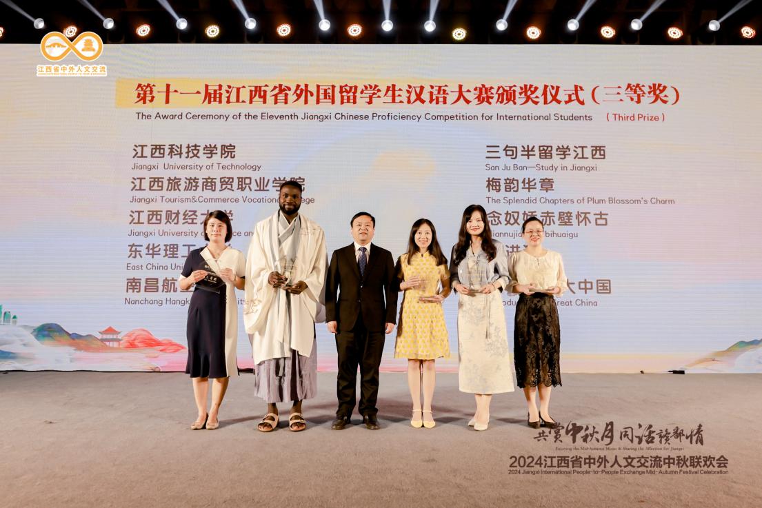 9月11日,由江西省教育厅指导,省教育国际合作与教师发展中心主办,南昌航空大学、江西国际教育研修学院协办的第十一届江西省外国留学生汉语大赛于南昌举行。经过决赛激烈比拼,我校教师聂庆、余玲指导的《梅韵华章》获三等奖;陆新老师指导的《赣江水宁红茶》获优秀奖。