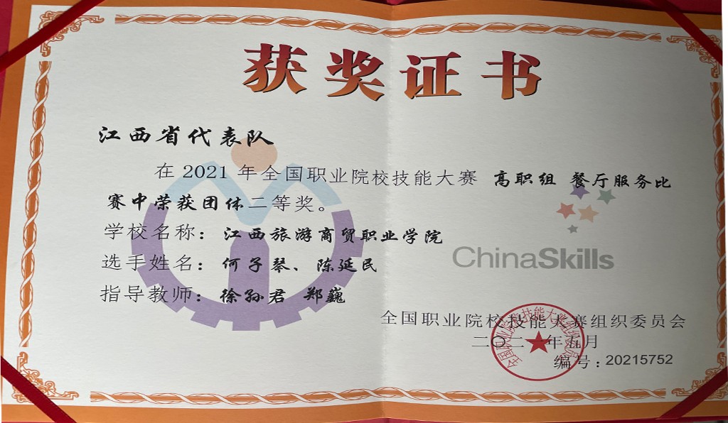 6月19至24日,2021年全国职业院校技能大赛的高职组餐厅服务赛项和高职组导游服务赛项,分别在青岛酒店职业技术学院、西宁城市职业技术学院举行。由我校酒店管理专业教师徐孙君、郑巍指导的何子琴、陈延民两位同学荣获高职组餐厅服务赛项全国团体二等奖,由旅游管理专业教师冯静指导的彭敏杰同学荣获高职组导游服务赛项全国二等奖。