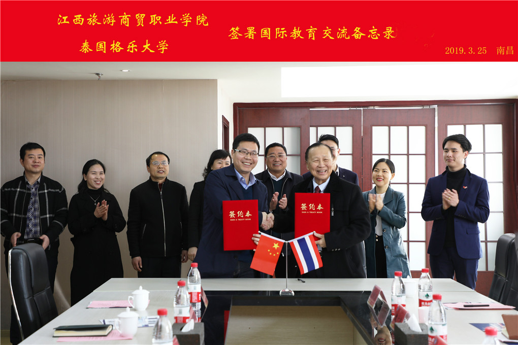 会上,双方就师资博士联合培养、学生游学深造、设立海外学堂、泰国来华留学生等事宜进行交流探讨,达成广泛共识,并现场签署了《江西旅游商贸职业学院与泰国格乐大学国际教育交流备忘录》。