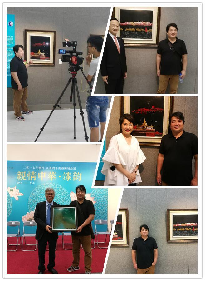 我校艺传学院教师龚国平作为江西省八位受邀的艺术家之一,代表学校参加了此次展览,其作品在展览现场广受追捧,获得好评,三幅参展精品分别被澳门三位社会名流有偿收藏:漆画作品《圣境》被梁安琪女士收藏,漆画作品《金山佛愿》被中国侨联副主席、澳门创世企业集团有限公司董事长、澳门归侨总会会长刘艺良先生收藏,漆画《潮歌》被澳门濠江印社社长丶澳门书法篆刻协会会长萧彼特收藏。