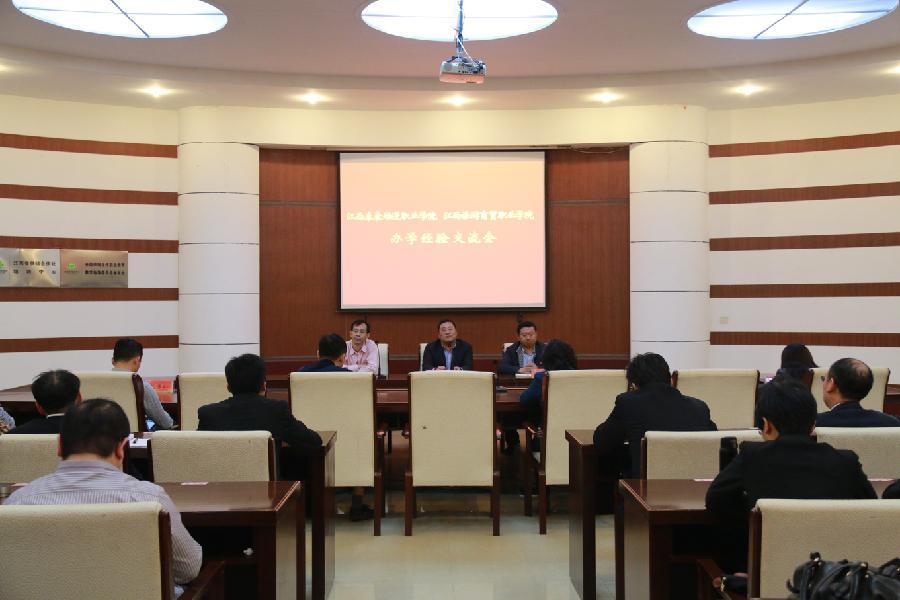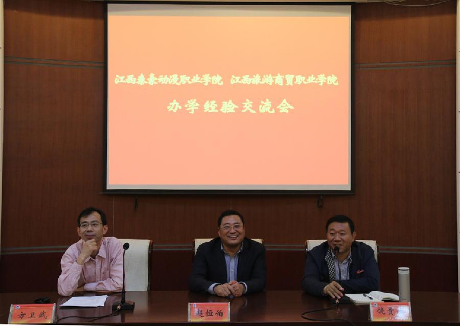 座谈交流会在行政楼一楼会议室举行。党委书记、校长赵恒伯在会上讲话,代表学校对饶贵生校长一行来校交流表示欢迎,并简要介绍了学校的办学历程、围绕旅游特色调整专业设置、学生获奖及创新创业教育、中外合作办学、江西教育旅游示范区建设、十三五规划间学校办学发展思路等学校办学基本情况。赵恒伯书记表示,江西泰豪动漫职业学院是省校合作的典范,学校实力雄厚,办学理念先进,动漫特色凸出,希望两校多加强交流合作,互相学习。