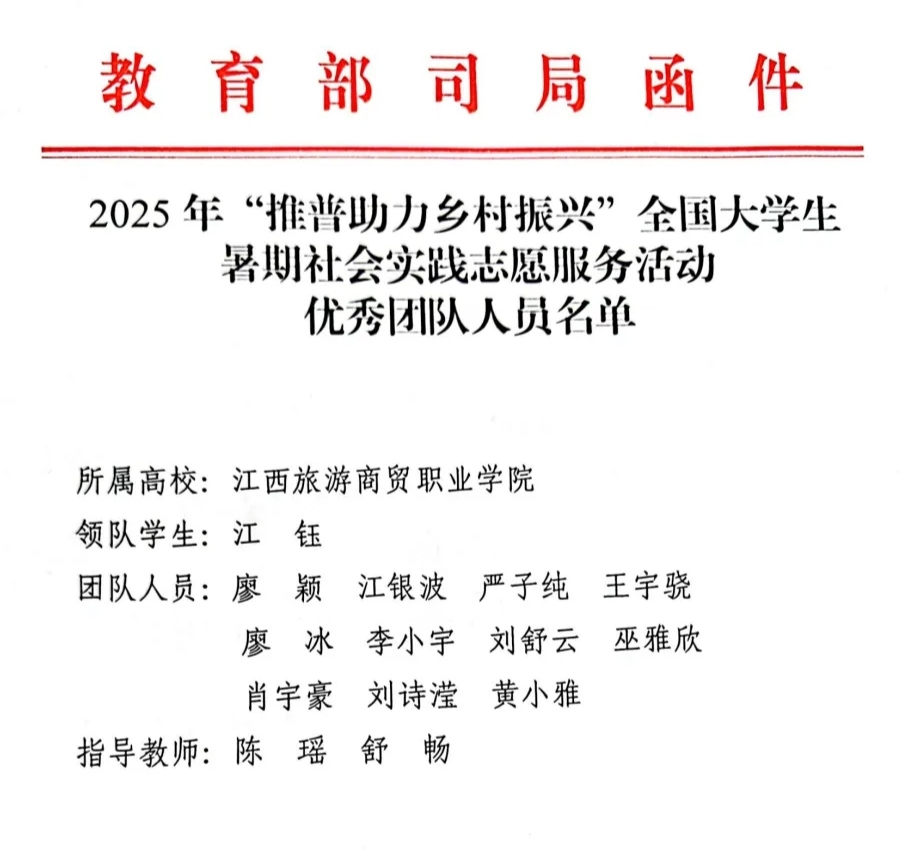 近日,2025年“推普助力乡村振兴”全国大学生暑期社会实践志愿服务活动优秀团队名单正式揭晓!我校“旅商梦”暑期社会实践队从全国2000支团队中脱颖而出,荣获国家级“优秀团队”,教育部语言文字应用管理司、共青团中央青年发展部致信表扬,充分肯定了学校在国家通用语言文字推广普及、助力乡村振兴及铸牢中华民族共同体意识等方面取得的积极成效。