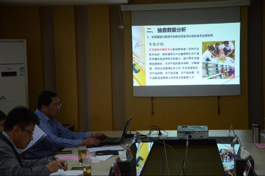 会上,我校党委书记、校长、供销行指委常务副主任赵恒伯首先代表供销行指委和学校,对教育部专家莅临指导表示热烈欢迎和衷心感谢。他代表《农资营销与服务专业职业教育教材质量抽查》项目组,采用PPT,作了项目研究报告。详细汇报了这次教材质量抽查的背景、教材质量抽查的目的和工作过程、项目进展情况、项目经费使用情况等,介绍了教材质量评价设计的指标体系,进行了调查统计数据分析,作出了评价结论。同时,提出了完善本专业和供销行业职业院校教材建设的意见和建议,包括:完善教材准入机制,规范教材选用秩序;开发具有行业特色的校本教材,配套教学辅导资料;建立行业教材质量检查制度,使教材检查工作常态化等。