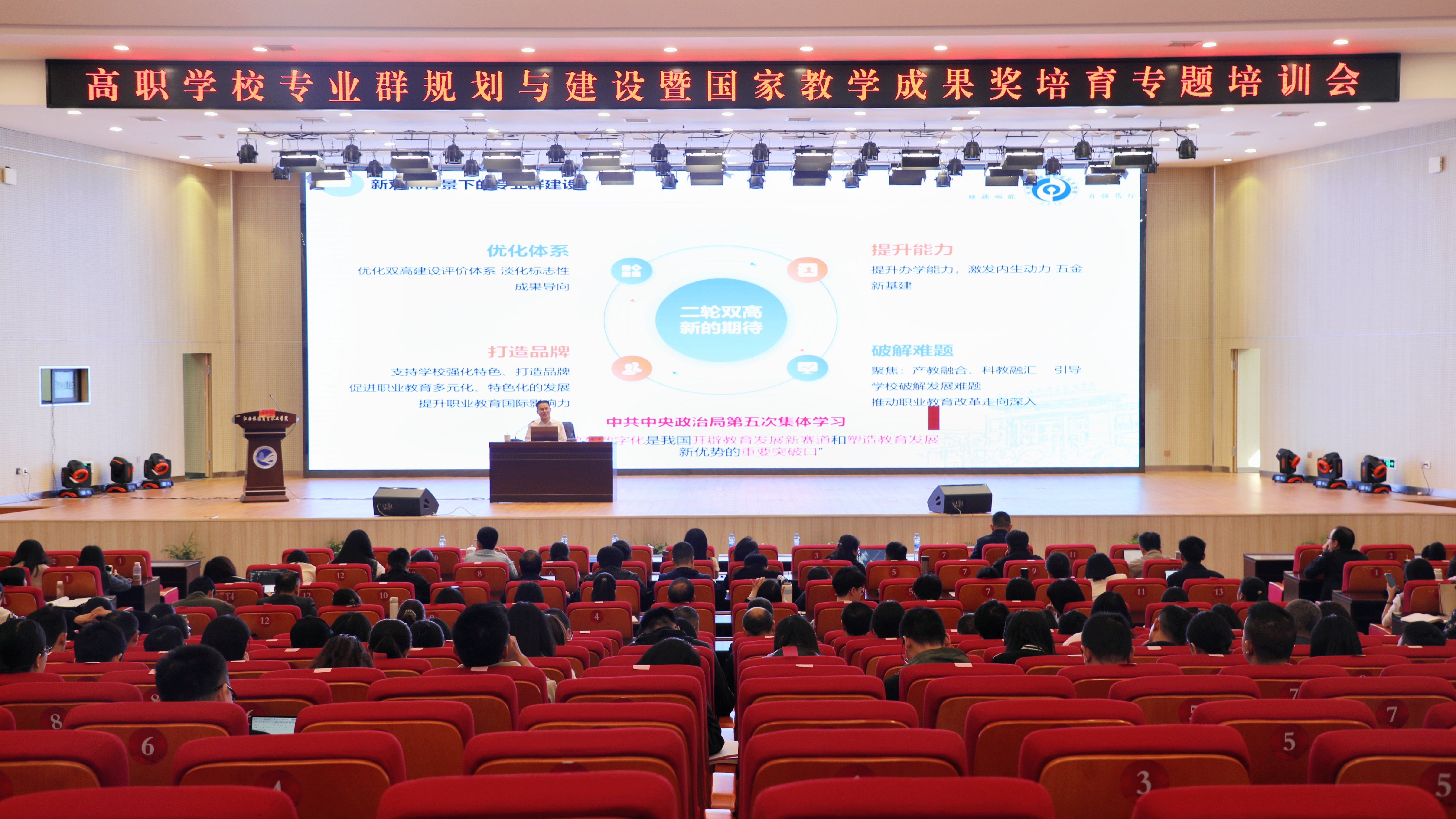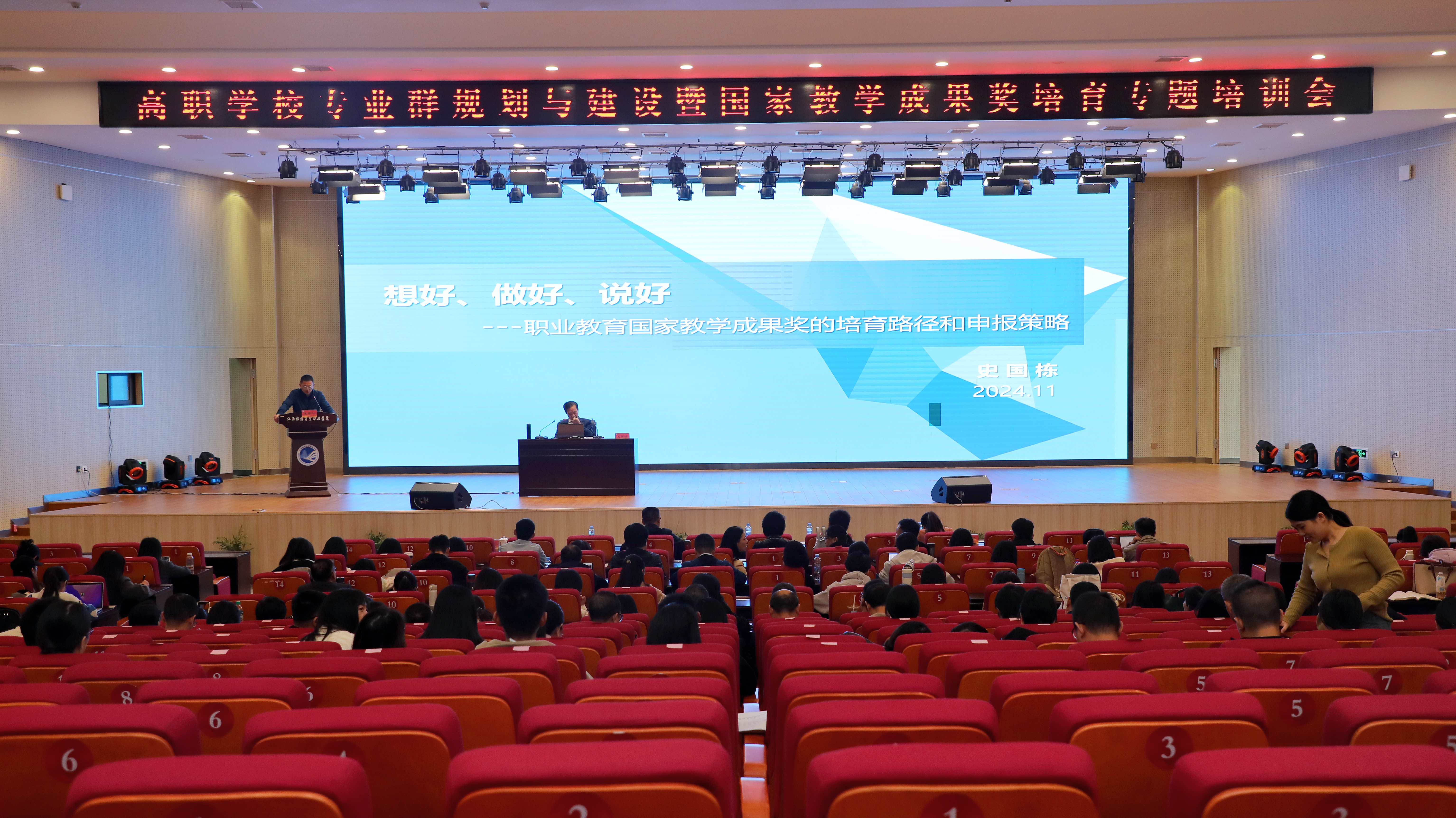 11月2日,学校在产教融合大楼一楼学术报告厅举办“高职学校专业群规划与建设暨国家教学成果奖培育”专题培训会。南京财经大学副校长叶林祥、江西财经大学教务处处长万建香,学校党委副书记、院长廖国琼,党委委员、副院长杨福盛,党委委员、教务处处长刘繁荣出席会议,各教学单位负责人、教研室主任、专业群负责人及校级教学成果培育项目主持人等140余位教师参会。