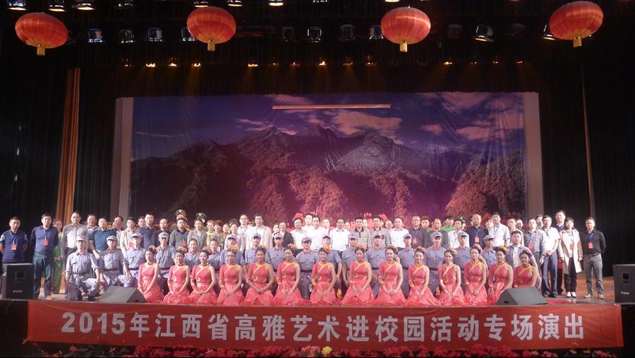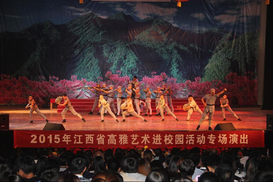 10月14日晚,学校文体中心大礼堂华灯璀璨,人潮涌动。2015江西省高雅艺术进校园活动——井冈山大学音乐舞蹈史诗《井冈山》再度走进我校,为我校师生带来一场高雅文化艺术的盛宴。省委教育工委党校常务副校长杜侦,学校党委委员、副校长范秀仁,井冈山大学艺术学院院长彭一敏、党委书记杨芳,全省第四期县(市、区)教育局党委书记(局长)培训班的36名学员和我校1000余师生观看了演出。