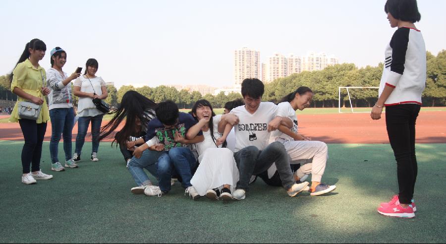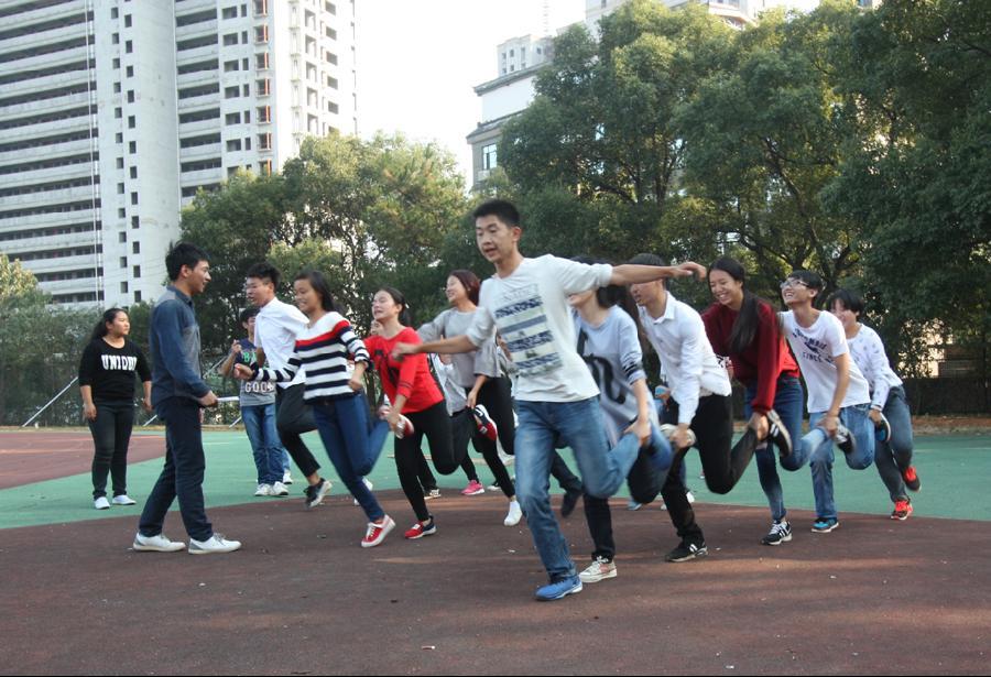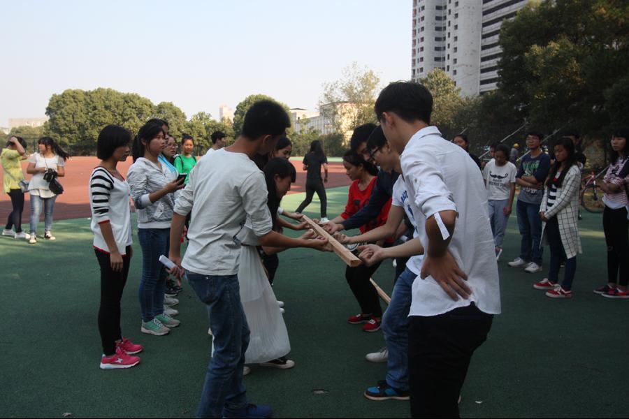 十月的下午,天气没有半点寒意,反而阳光明媚。就如此时同学们的心情一般。在开始游戏前队长让队员充分发挥创造和想象力,为各自所在队伍想口号和队名,有充满青春自信的美少年队,有带着古典气息的八仙过海队,队名各色各样,古灵精怪。游戏还没有开始,大家纷纷摩拳擦掌跃跃欲试,热情高涨,从齐眉棍到坐地起立,从链接加速再到七彩连环炮。一轮轮比赛顺利进行,最叫人捧腹大笑的要算链接加速环节吧!这个游戏主要考验团队之间的合作能力,每个人需要将自己的左脚抬起由后面的同学拉住,自己的右手则搭在前人的肩膀上,依次成链条状,比赛过程中不允许断开,断开者回到起点重来,有的同学体力不支,被前后同学架着走,活活像一串烤羊肉,有的队伍出现断裂,结果是抱着后来人的鞋子走。现场无不被这突发情况逗乐,掌声、加油声、欢笑声不断。