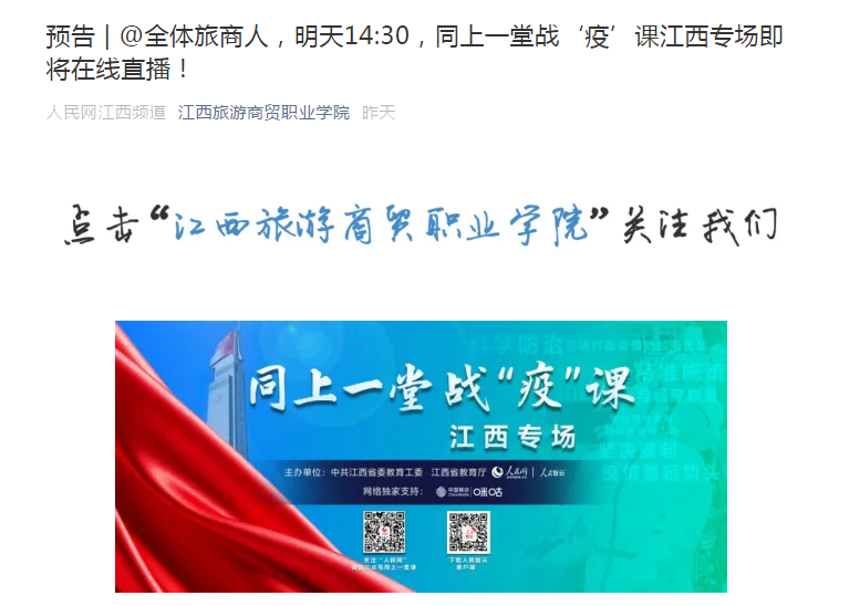 马克思主义学院蔡思雨老师:这堂战“疫”思政大课,再次让人热血澎拜,热泪盈眶。作为一名思政教师,我将结合战“疫”一线的感人案例讲好新时代青年故事,江西故事,中国故事,不断增强思政课的思想性,理论性,亲和力和针对性,引导学生扣好人生的第一粒扣子。