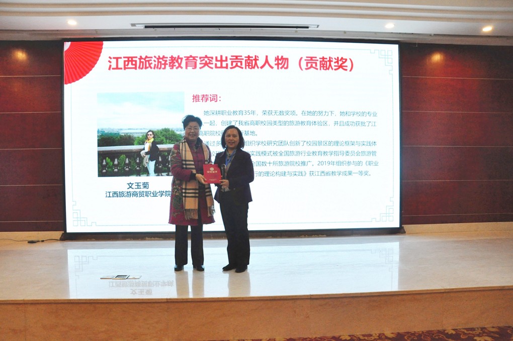 会上,江西省旅游协会旅游教育分会公布了首届“江西旅游教育杰出青年教师”、“江西旅游教育名师”、“江西旅游教育突出贡献人物”等获评名单;江西旅游职业教育集团公布了“2019 年度江西旅游职业教育集团先进单位”获评名单。学院副院长、江西旅游职业教育集团常务副理事长文玉菊获评首届“江西旅游教育突出贡献人物”称号,旅游学院院长、江西旅游职业教育集团秘书长张蕾获评首届“江西旅游教育名师”称号。