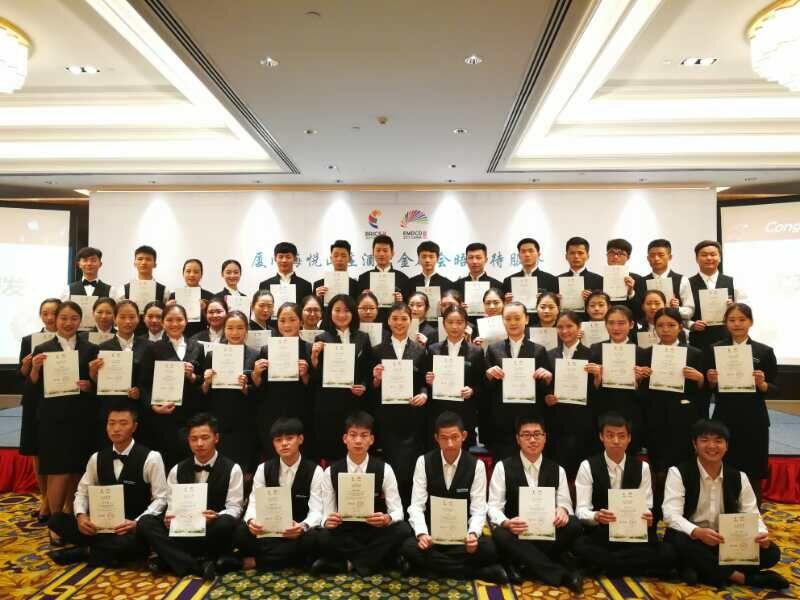 为了更好的完成此次接待任务,出发前,学院召开了动员大会,提出了“人人都是东道主,我们使命光荣责任重大,务必要把此次活动服务做到最好”的要求。7月5日上午,同学们抵达金砖接待酒店—厦门海悦山庄,开始了为期两个月的严格培训。从专业理论到实际操作,从外语培训到涉外礼仪,包括体能训练,直到所有培训考核合格后,同学们开始陆陆续续的出现在一些宴会接待中进行锻炼。在不断学习和实践中,迎来了金砖五国会晤。