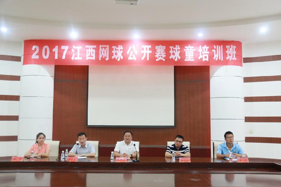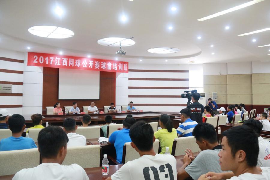 7月16日,2017江西网球公开赛球童培训班开班仪式在学校行政楼一楼会议室举行。党委书记、校长赵恒伯,江西网球公开赛组委会副秘书长、江西省体育发展有限公司董事长、总经理吕少军,江西网球运动管理中心副主任龚志刚,及68名入选球童和部分家长等参加了开班仪式。