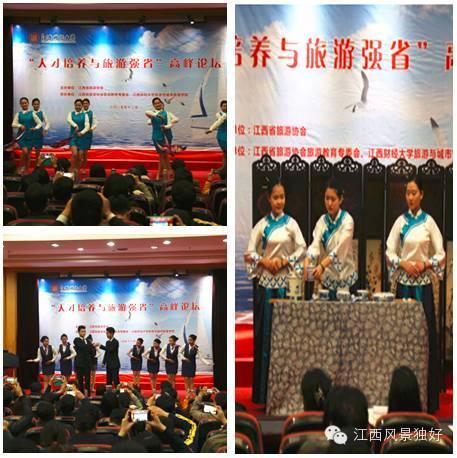 下午的论坛,南昌师范学院和我校学生进行了茶艺和礼仪专业技能教学成果展示。抚州市梦湖和湿地管理中心雷音媛、南昌力生国际酒店单文峰、北京巅峰智业旅游文化创意股份有限公司黄成、南昌大学龚志强教授、江西师大冯淑华教授、南昌师院殷剑教授、九江学院李松志教授、江西旅游商贸学院张蕾教授、江西财大邹勇文博士等作了主旨发言,与会专家围绕“人才培养与旅游强省”进行了深入的研讨交流。(旅游发展研究所供稿 宣传部编辑)