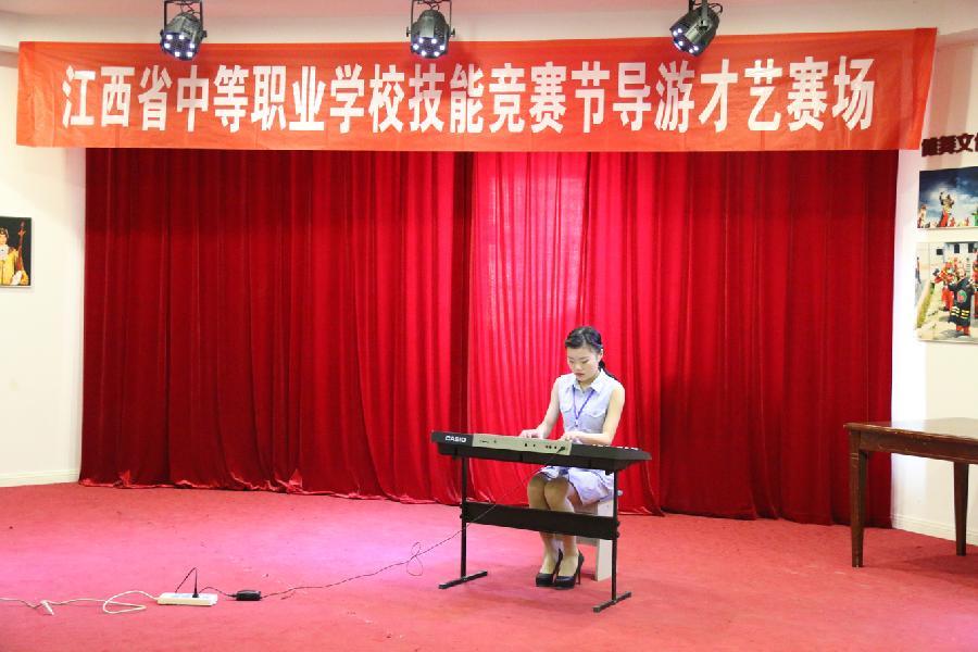 导游技能竞赛由导游综合知识测试、才艺展示、自选景点讲解、抽选主题讲解四个部分组成。导游综合知识测试内容包涵中国旅游地理、江西旅游资源、导游业务知识及案例分析。才艺展示部分参赛者事先在歌舞、戏曲、乐器、相声、小品、口技、朗诵、魔术、武术、讲故事等才艺项目中选择一项进行3分钟时间展示。自选景点讲解部分选手在赛前根据选题范围准备一段4-5分钟的导游词和相应的PPT资料,进行模拟导游讲解。抽选主题讲解部分选手在现场抽取四个主题“饮食文化、建筑艺术、历史人物、民俗民情”中的一个主题内容,对其进行1.5-2分钟的模拟讲解。
