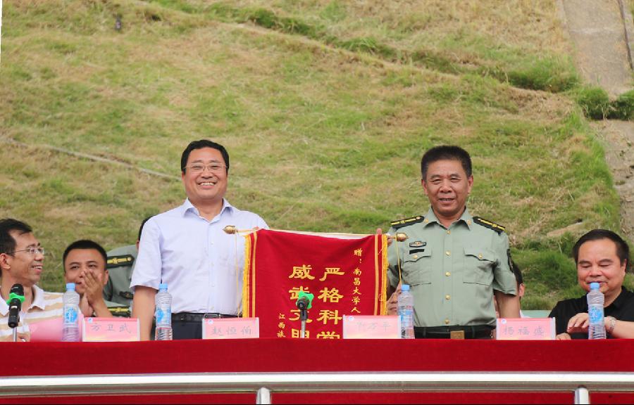 会上,赵恒伯书记代表学校向此次承担我校新生军训任务的南昌大学人民武装学院赠送了锦旗。