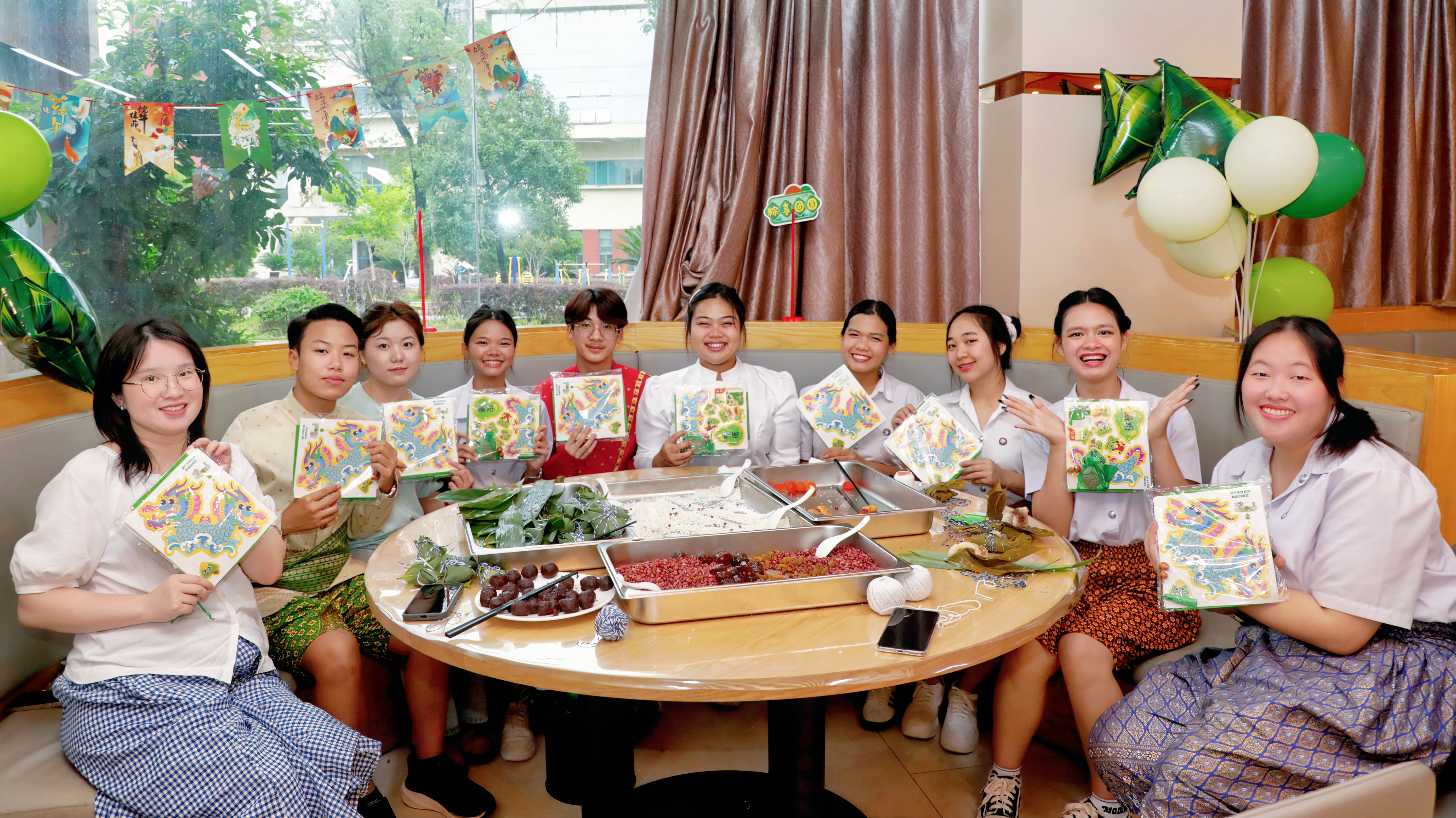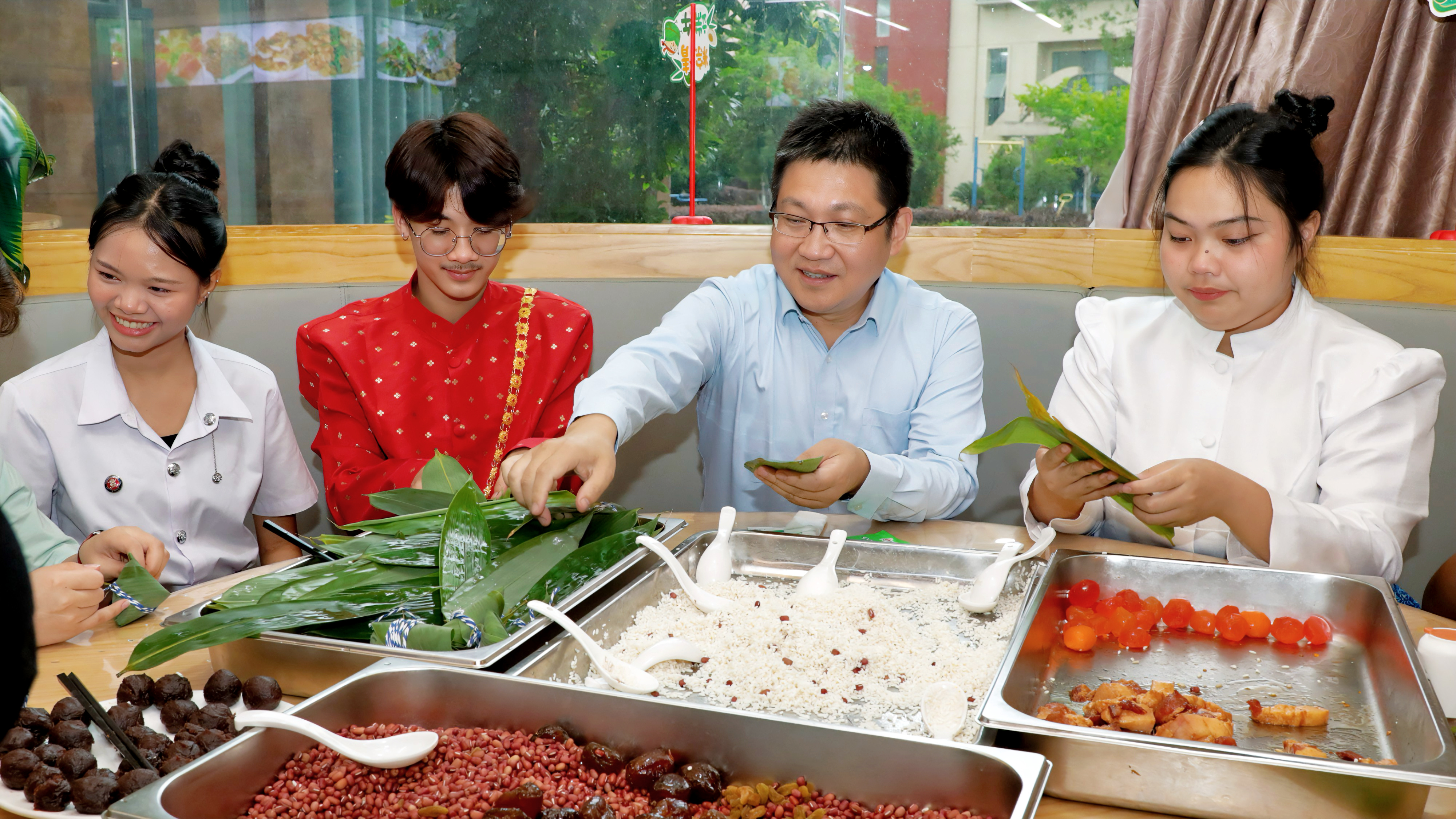 端午节前夕,学校举行“品味中国传统文化‘粽’享端午民俗雅趣”——第二届中泰青年友好交流会暨“弘扬工匠精神 传承非遗文化”主题实践活动。学校党委副书记、院长廖国琼与泰国留学生、第16期大骨班学员及2024级物流管理1班全体学生相聚一堂,欢度端午佳节。校领导龙婷、刘繁荣参加活动。