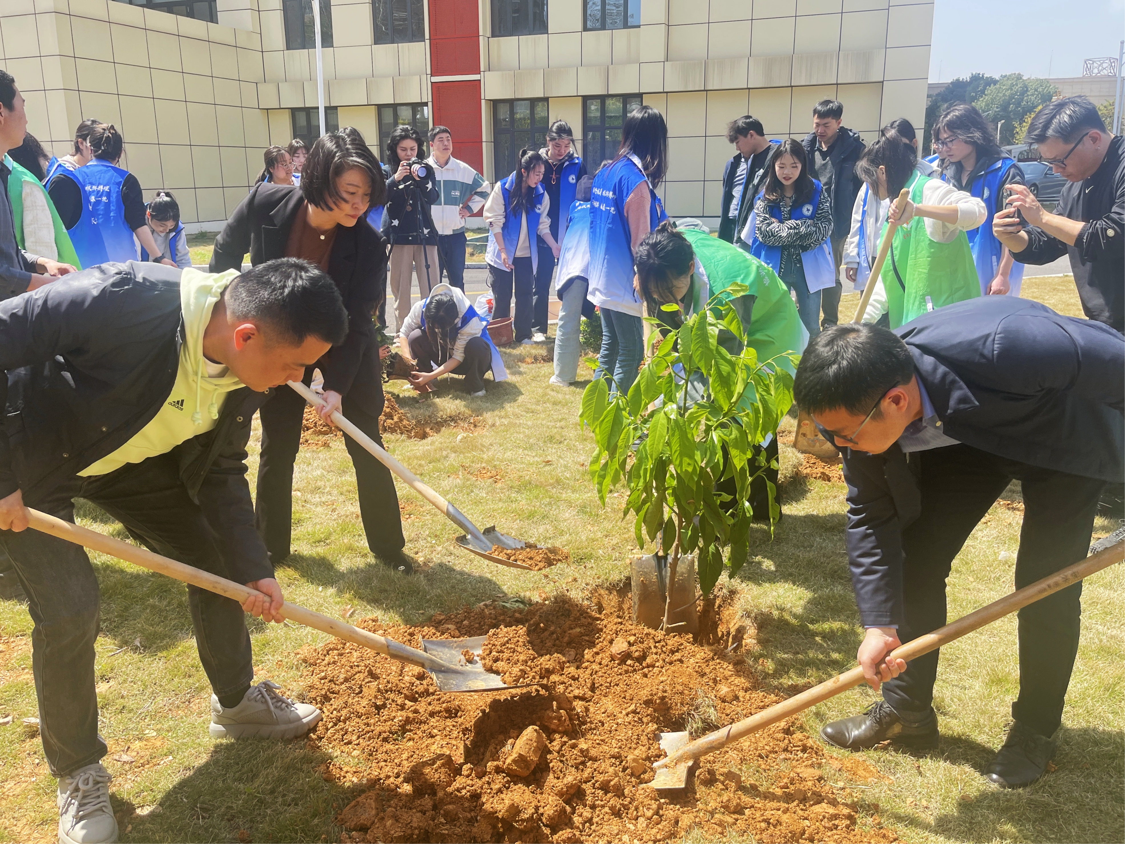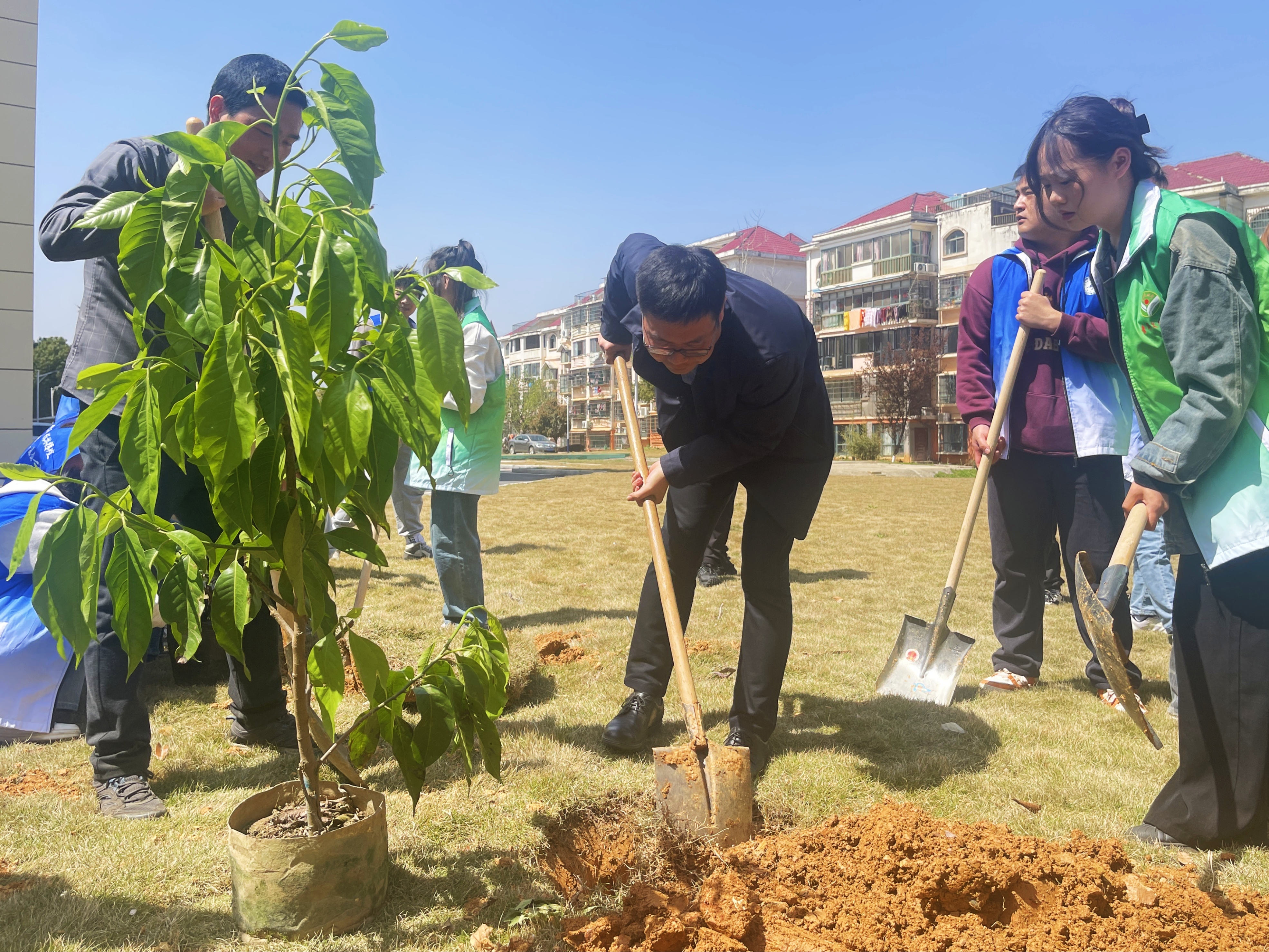 活动现场,吴小平与同学们手执铁锹与镐头,相互配合,挖土放苗、扶苗培土、踩土固苗,经过师生的辛勤劳动,一棵棵树苗整齐扎根在土壤里,彰显着勃勃生机,为校园增添一份新春的活力与气息。在种植过程中,吴小平叮嘱同学们“树坑要挖深挖宽点,树苗要扶正,培土要实,浇水要透,这样树苗才会顺利存活并茁壮成长”。