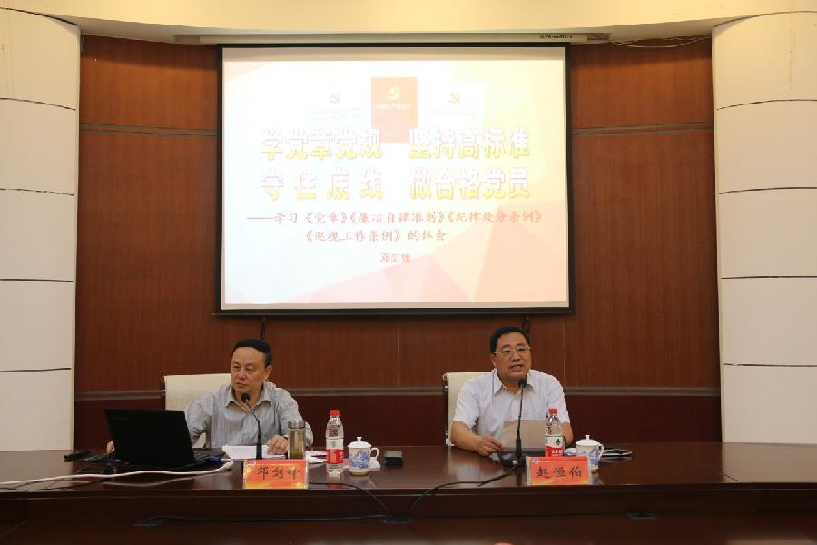 为深入开展“两学一做”学习教育,增强广大师生党员党性修养。 5月24日下午,我校邀请江西省纪委常委、省直机关工委巡视员邓剑锋来校开展了一场主题为《学党章党规 坚持高标准 守住底线 做合格党员》的专题讲座。讲座由党委书记、校长赵恒伯主持,学校党委领导班子、全体党员中层干部、各学院党总支及直属支部支委成员聆听了讲座。