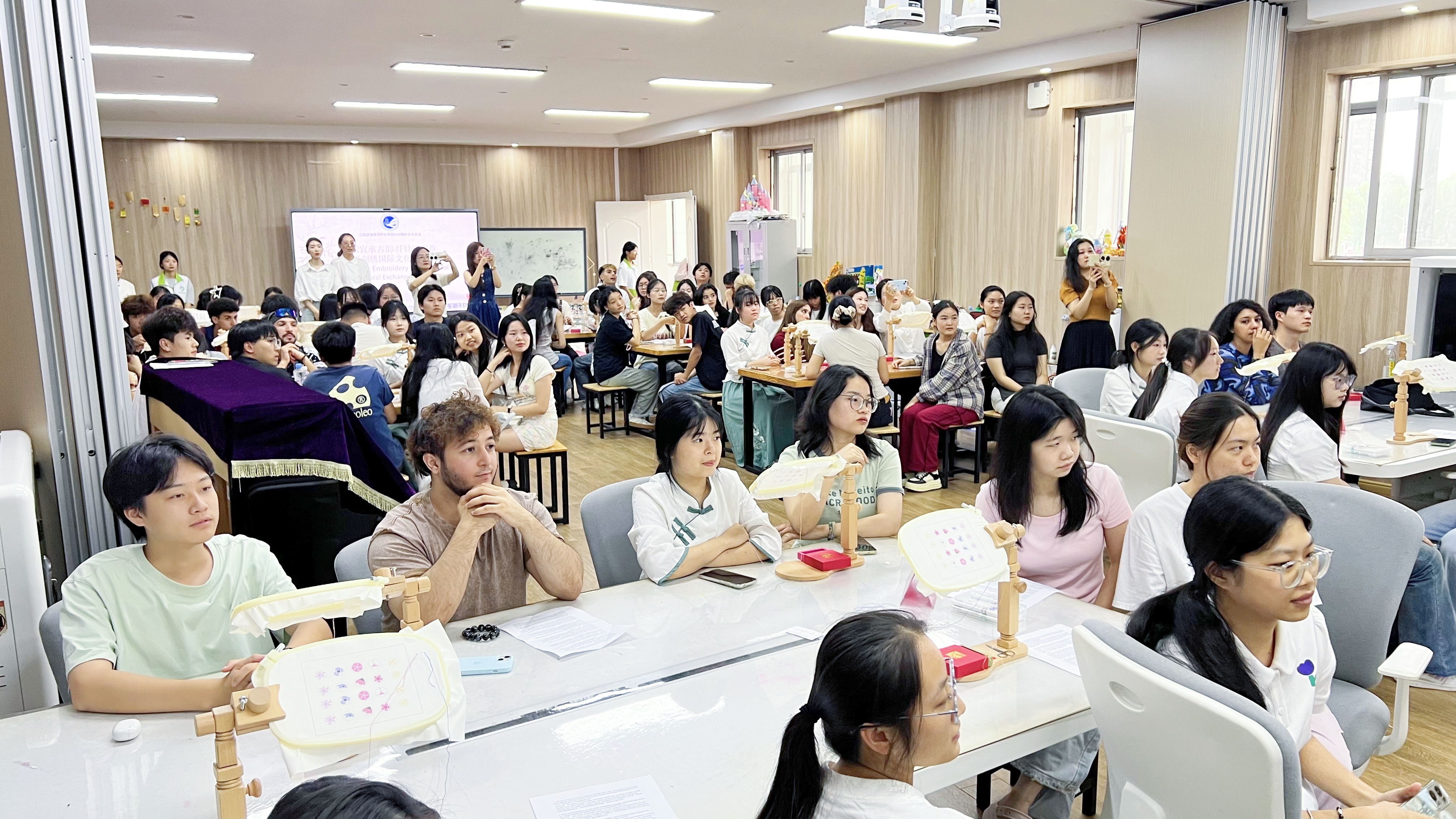 为推动中华优秀传统文化国际传播,6月11日,我校在第二教学楼202智慧教室举办2025年度第三期“素宣承古韵·纤针绣华章”国际文化交流活动。学校国际合作交流中心、国际商务学院负责同志,非遗宣纸刺绣第九代传承人顾玉纯、第十代传承人顾志鹏出席,100余名中外师生参与。活动以南昌宣纸刺绣技艺研习为核心,通过技艺展示、手作体验及跨文化对话,展现宣纸与刺绣融合的独特魅力,为传统工艺注入活力。