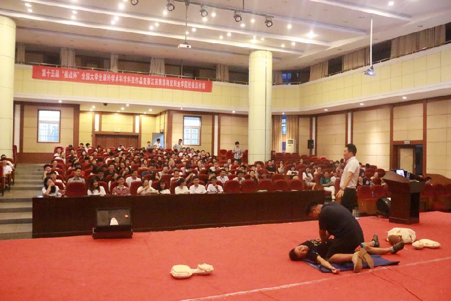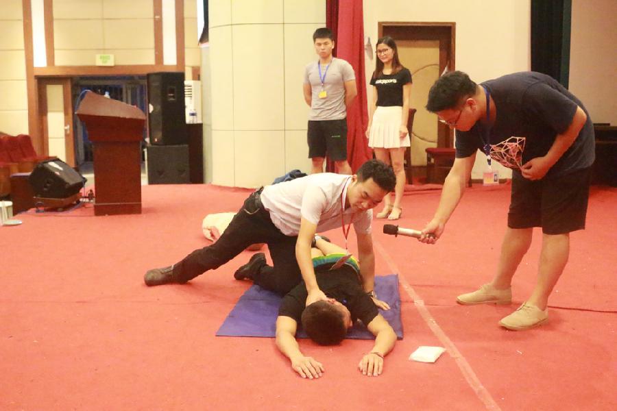 为学以致用,陈老师还现场演示了心肺复苏的技能操作,三名即将参加学校2017暑期“三下乡”的学生代表在老师的指导下进行了现场体验操作。同学们一边聆听讲解,一边观察具体行动,现场气氛活跃,学习兴趣与积极性得到充分激发。