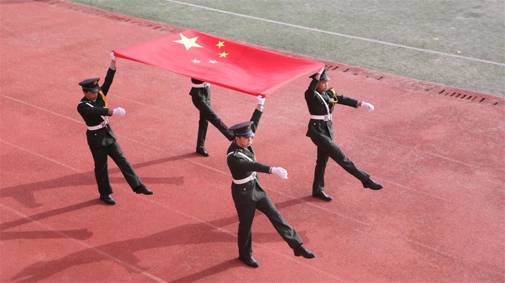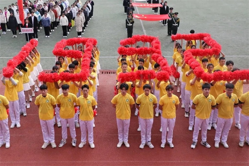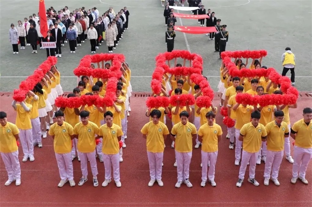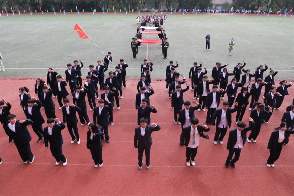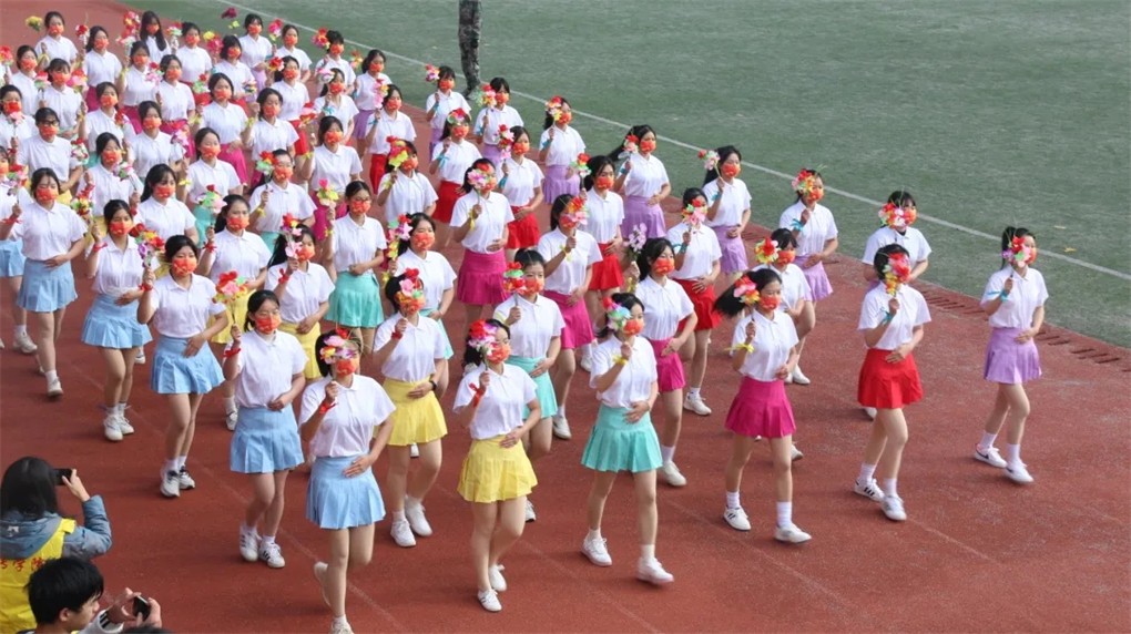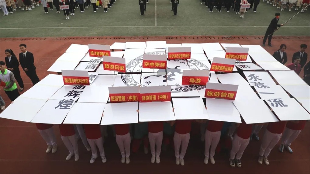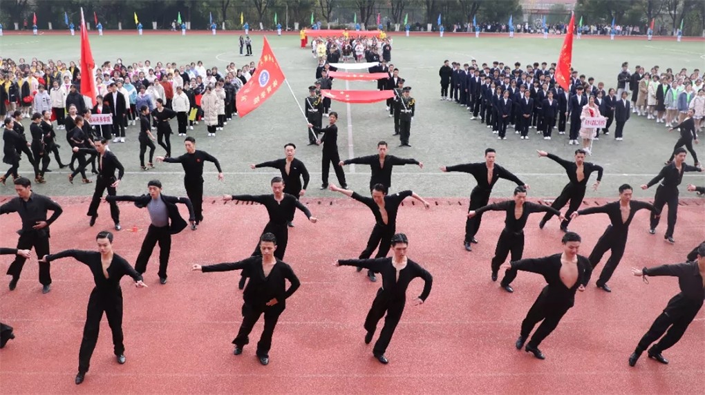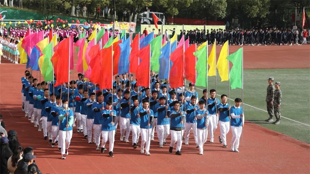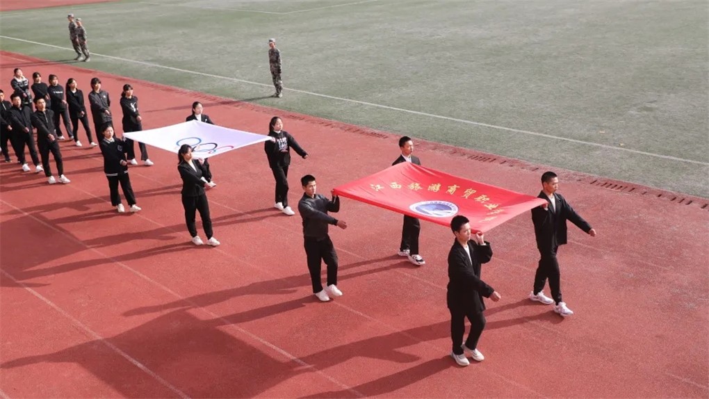 国旗护卫队,雄赳赳,气昂昂,国旗手一丝不苟,严阵以待,体现了学校团结务实,和谐进取的优良校风;校旗队精神抖擞,充分体现了学校开拓创新,勇往直前的精神风貌;奥林匹克运动会会旗队,他们矫健的身姿,飒爽的风采,预示着学校走在时代的最前列!机电与建筑工程学院学生组成的彩旗队,象征着本届运动会如这迎风飘扬的彩旗一样五彩斑斓,充满生机。旅游学院72 名学生组成的鲜花队挥舞着鲜花向全场致意,绚丽的花束洋溢着青春的活力,耀眼的花环袝托着热情的笑脸,展示着新时代职教学生的风采。