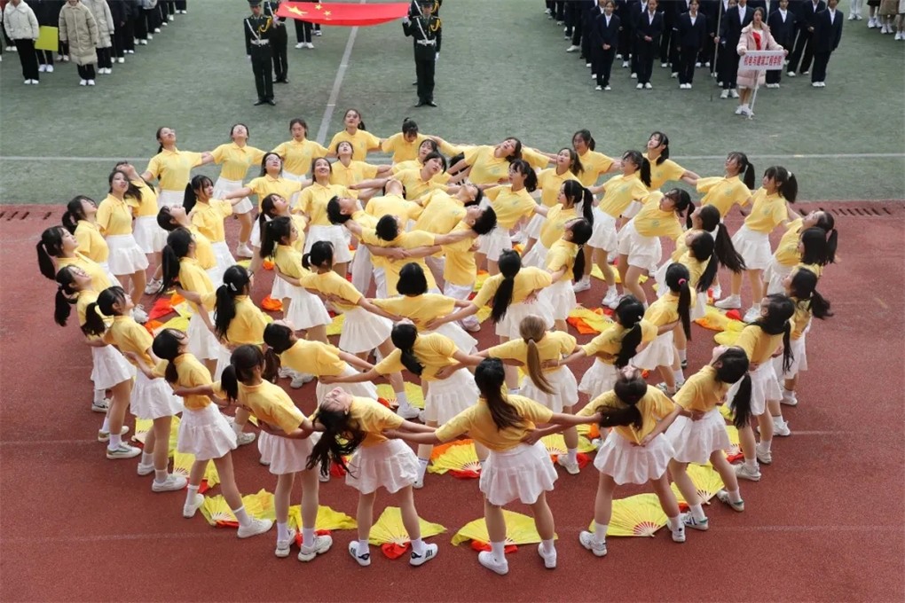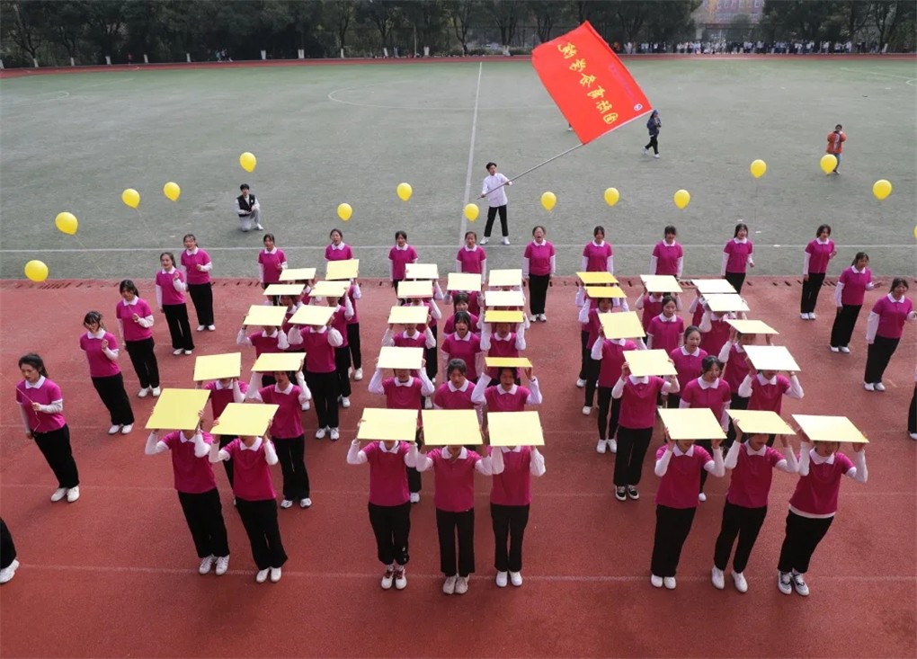 艺术传媒与计算机学院代表队身着黄色队服,摆出花蕾状慢慢在阳光下绽放。稳中求进、挑战自我是他们的起点;不懈努力、不倦追求是他们的历程;突破自我、争创第一是他们的目标。