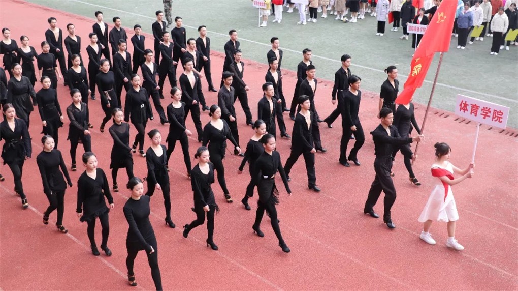 音乐响起,体育学院代表队律动的舞姿演绎着青春的蓬勃,他们是一支敢于梦想,勇于拼搏,不断进取的团队,年轻自信洋溢在他们的笑脸上。
