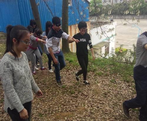 此次培训采用理论讲解和活动体验相结合的方式,在心理团体辅导室、心理沙盘活动室、户外场地进行培训。其中,4月1日,开展了一次以“人际关系”为主题的培训活动,此次活动除了讲解之外,还进行了“猜谜”“人椅游戏”“盲行”三个活动。每个活动结束时,学生们都分享了自己的感悟体验,培训师也与学生进行了交流,在分享中,培训师和学生都获得了成长。“猜谜”游戏中,让学生明白了人际交往中正确理解他人的重要性;“人椅游戏”,让学生明白了团结和相互帮助的重要性;尤其是在“盲行”活动中,学生们真切体验了人际交往中相互信任和沟通交流的重要性。