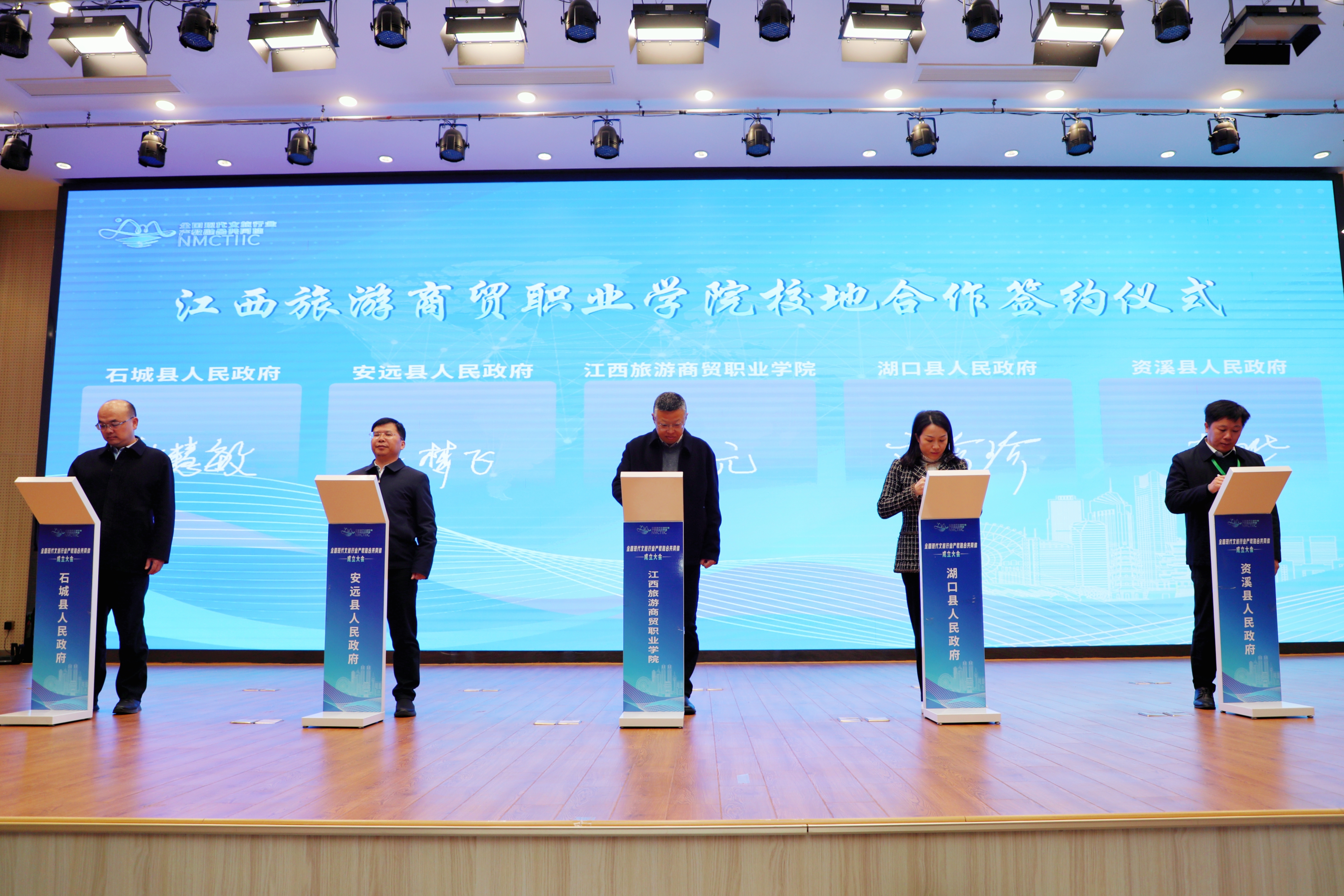 作为共同体成立后的第一项标志性成果,江西旅游商贸职业学院分别与安远县人民政府、湖口县人民政府、石城县人民政府、资溪县人民政府举行校地合作签约仪式。江西旅游商贸职业学院党委副书记、院长彭元分别与安远县委常委、统战部部长辛梦飞,湖口县委常委、宣传部部长文珍珍,石城县委常委、宣传部部长钟慧敏,资溪县人民政府党组成员、副县长李晔等签署了校地合作协议。