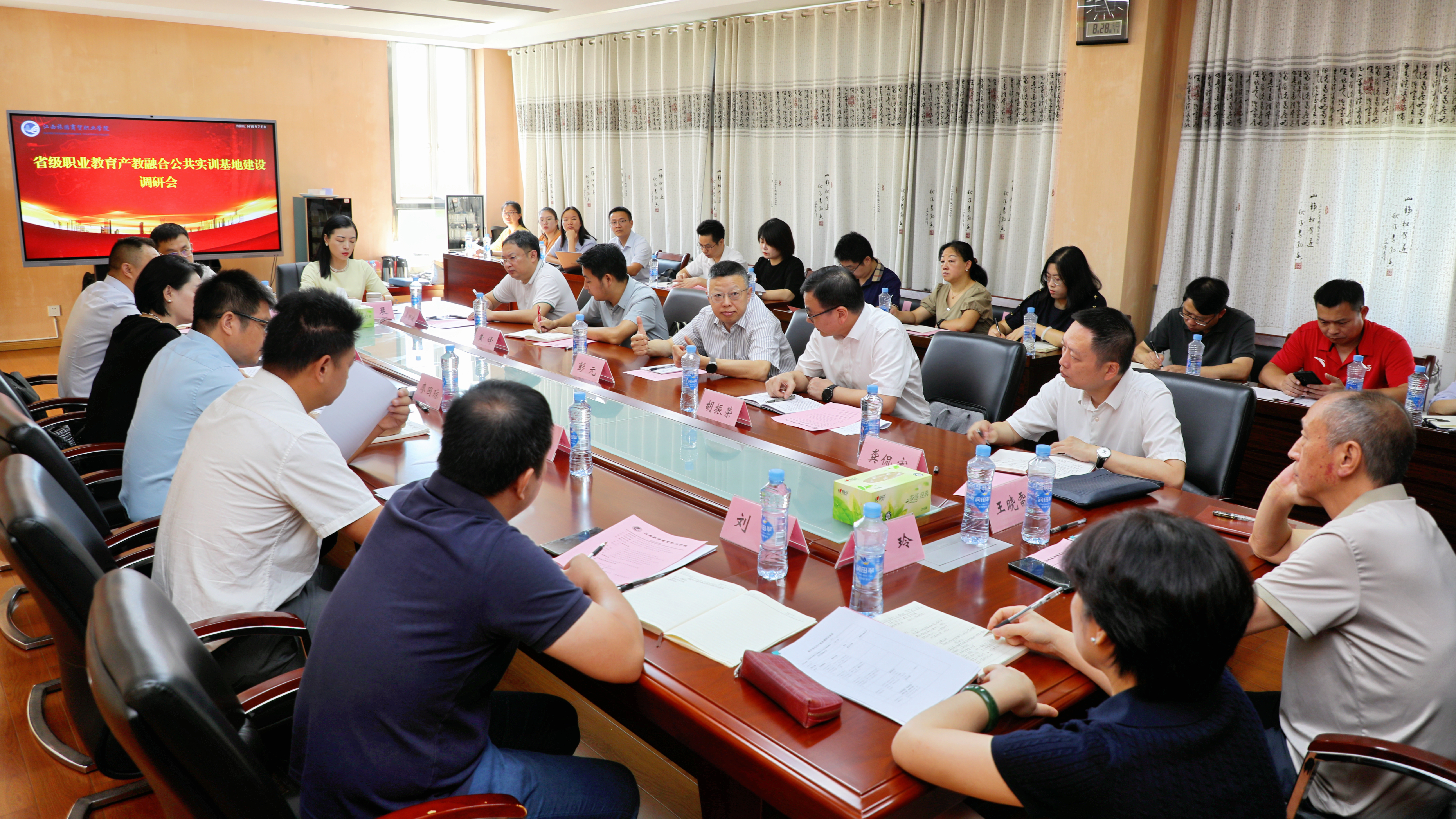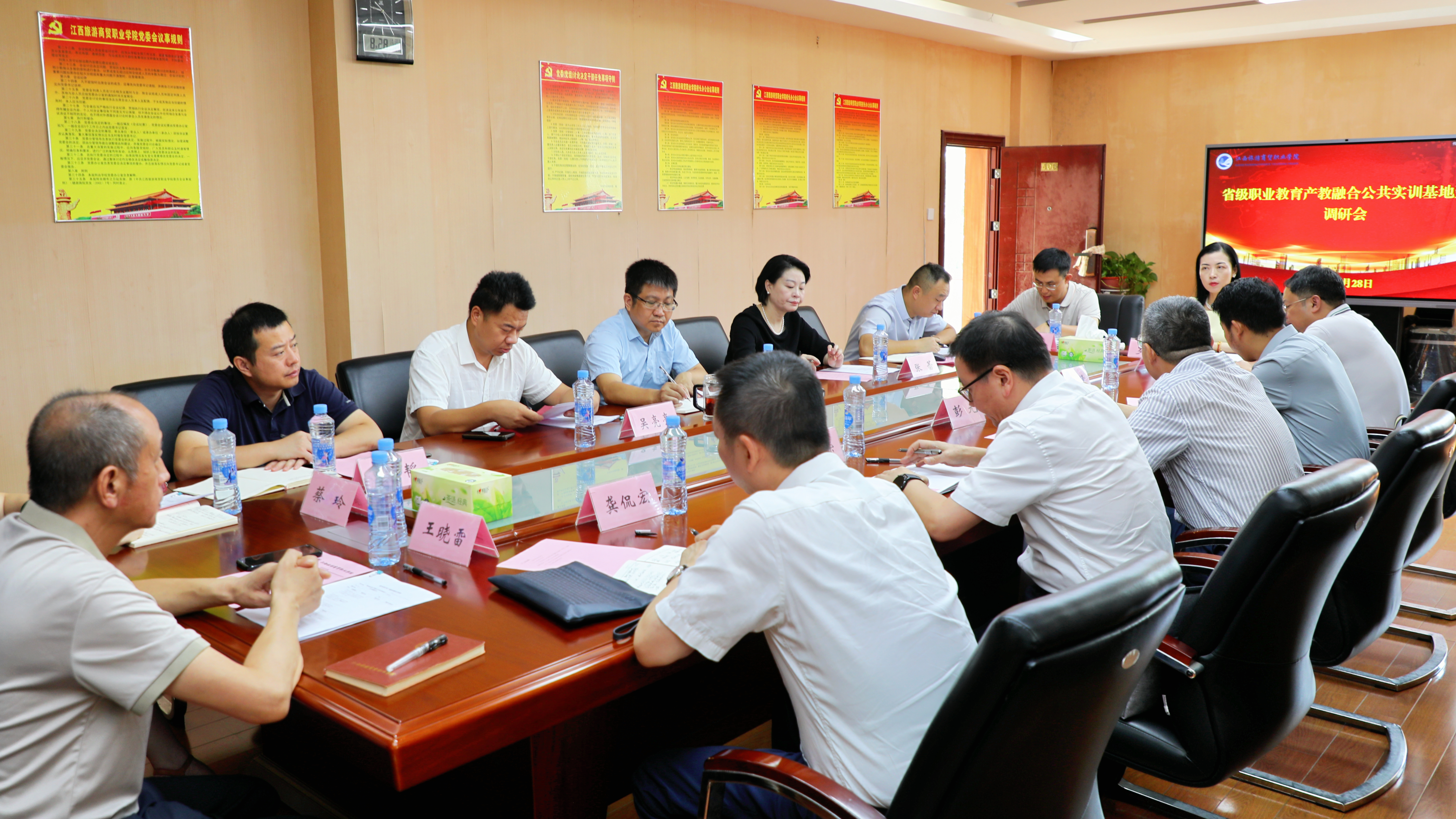 8月28日上午,由江西省人才发展集团党委书记、董事长彭元带队的省级职业教育产教融合公共实训基地专家组一行六人来校调研。学校党委副书记、院长廖国琼,党委委员、旅游学院院长张蕾,华住酒店管理有限公司全季酒店总经理吴亮亮,学校相关职能部门、二级学院负责人参加座谈。