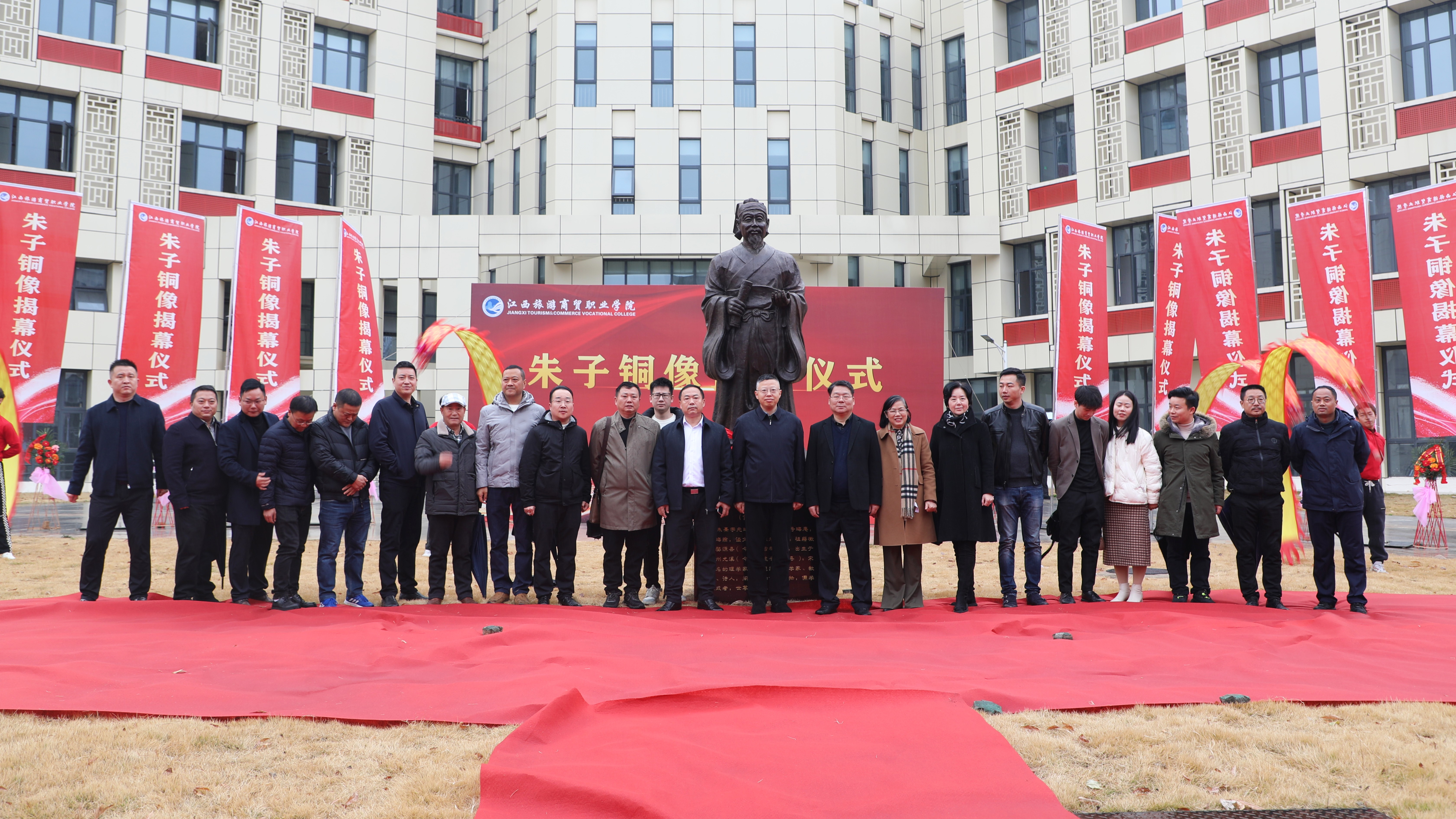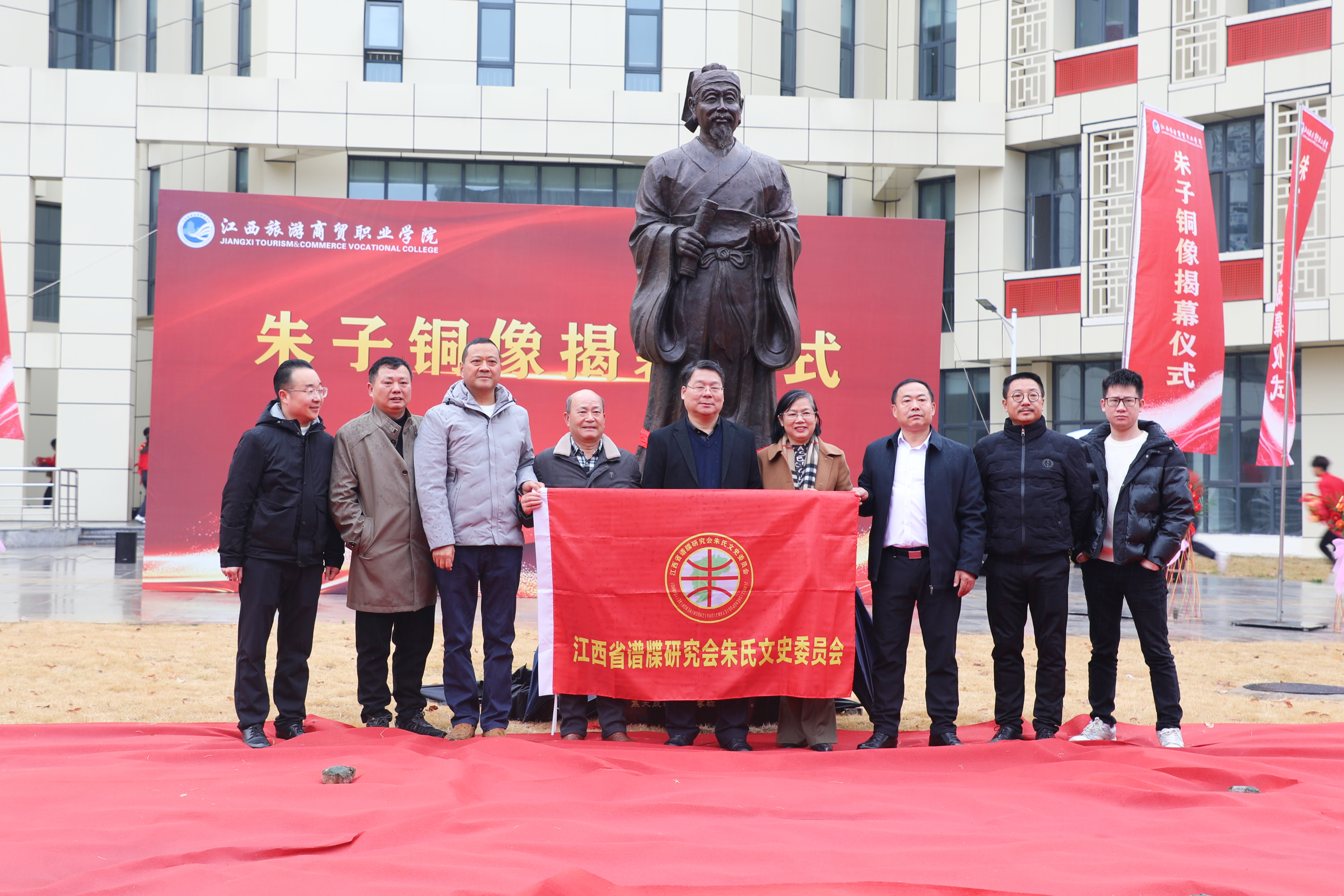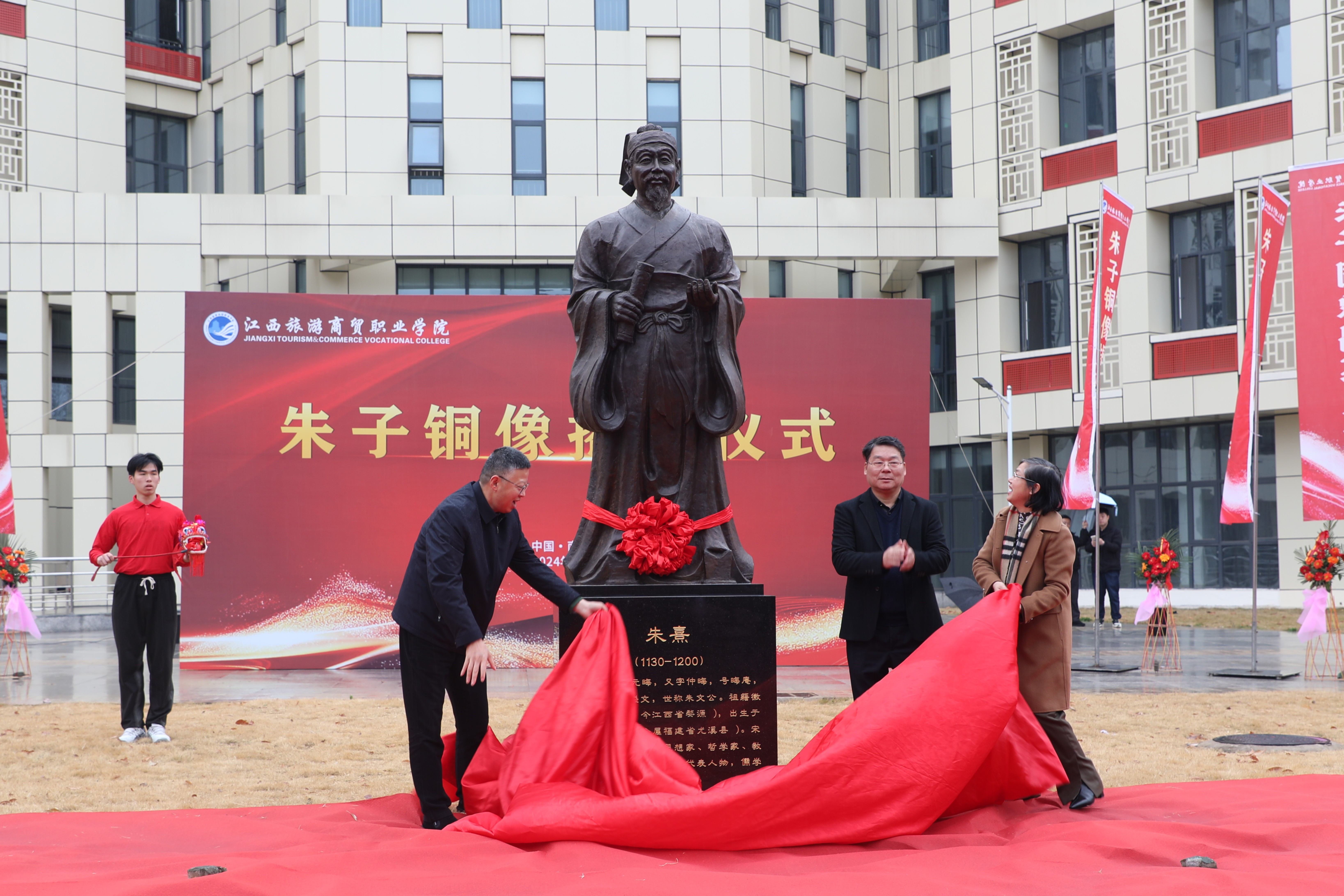 1月18日上午,学校举行朱子铜像揭幕仪式。学校党委副书记、院长彭元,党委委员、旅游学院院长张蕾,江西恒大集团有限公司董事长朱星河,总经理、校友胡恩雪,工会主席管海霞,江西省谱牒研究会朱氏文史委员会常务副会长朱模雄,南昌艺达数码公司总经理、校友兰小平,江西云诚信息技术公司总经理、校友舒平,江西文博疗养服务中心有限公司总经理、校友李岢等出席活动。