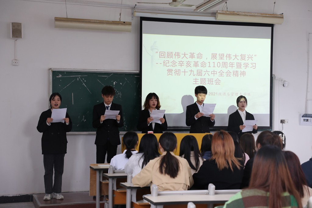 活动中,曹彦玲、饶志琴、黄芳芳、欧阳子恒、王智博五名同学围绕“立足新发展,展望新未来”主题,深情朗诵了《辛亥之歌》。旅游学院相关负责同志参加活动。(宣传统战部 供稿)