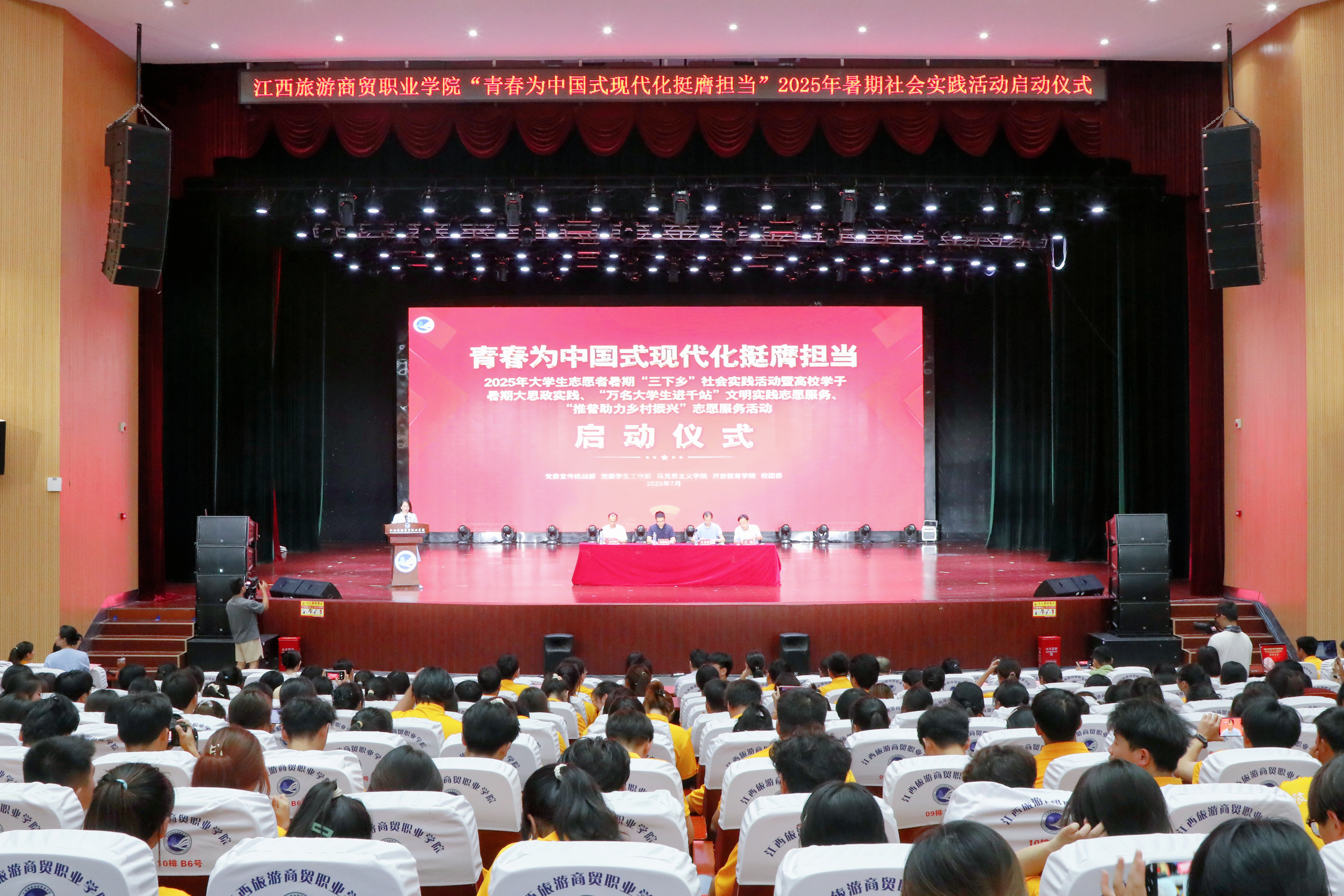 7月4日上午,学校在文体中心大礼堂举行2025年大学生志愿者暑期“三下乡”社会实践活动暨高校学子暑期大思政实践、“万名大学生进千站”文明实践志愿服务、“推普助力乡村振兴”志愿服务活动启动仪式。