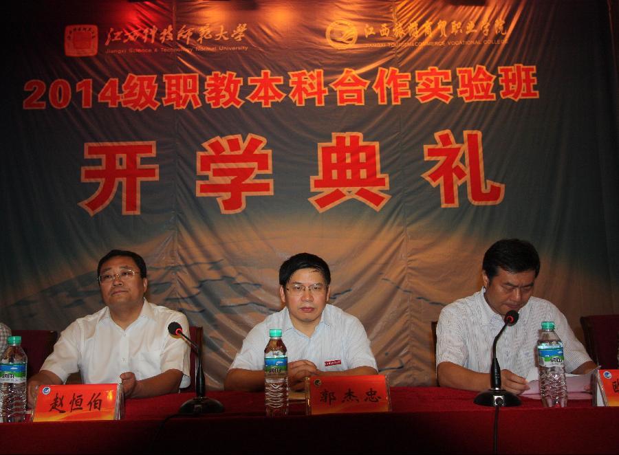 江西科技师范大学校长郭杰忠在讲话中指出,江西科技师范大学非常重视与江西旅游商贸职业学院合作举办的应用技术型本科班,两校已就首届职教本科班的人才培养方案进行了充分的对接完善,将结合各自的优势,实现优势互补,共同把首届职教本科班办成全省职教本科的品牌班、示范班、精英班。郭杰忠校长希望首届本科班的同学牢记江西科技师范大学明德精业的校训,发扬科技师大新生给父母、老师、自己写三封信的优良传统,做一个懂得感恩的人;并对首届本科班的同学提三点要求:一要修德,大学生也是社会的一员,要做社会道德的模范与引领者,做一个德才兼备的人;二要精业,要充分发挥两校的优势,既要注重理论知识的学习,也要注重实践能力的培养,做一个理论与实践兼备的人;三要笃行,要学以致用,为我省经济社会发展,为我省打造旅游强省贡献自己的力量。