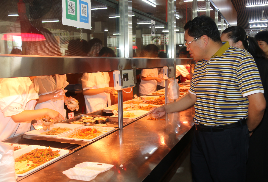 在第一食堂,赵恒伯书记向食堂工作人员询问了菜价以及分量,听取了新生对菜品的意见和评价,要求食堂从业者要做放心饭菜,确保食品安全的同时,还要多出花样,尽量满足不同口味需求。