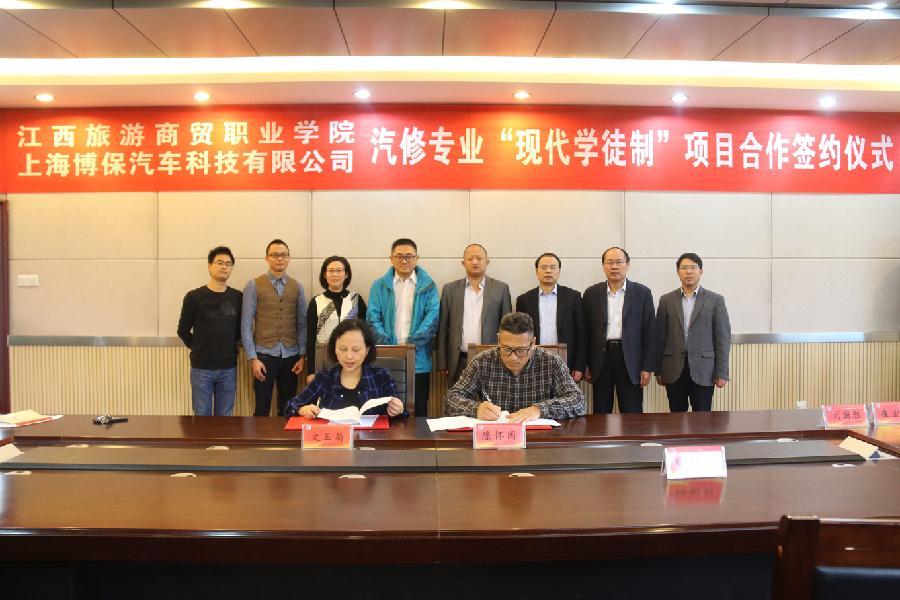 10月28日上午10点,我校和上海博保汽车科技有限公司校企合作开展汽修专业“现代学徒制”项目签约仪式在行政楼三楼会议室举行。校长助理文玉菊、上海博保汽车科技有限公司总经理陈怀国分别代表校企双方签字。