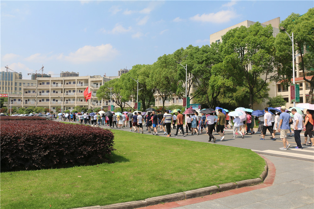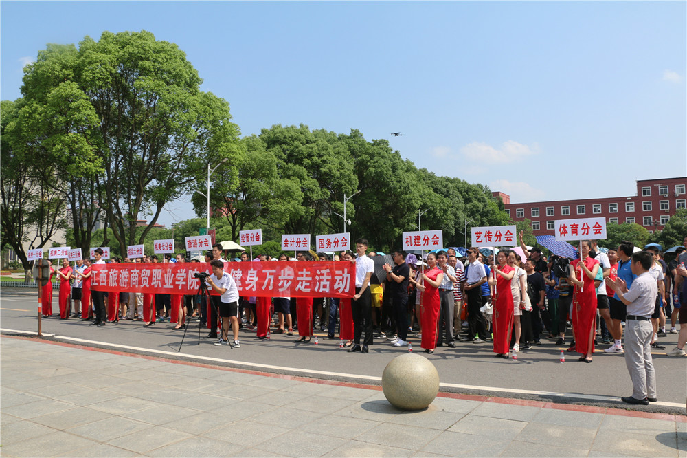 下午2点30分,积极参与活动的430名教职工,不怕34摄氏度高温,早已列队就绪,整装待发。随着党委书记赵恒伯一声令下:“江西旅游商贸职业学院全民健身万步走活动正式开始”。教职工们沿着活动设定路线从神龙广场国旗下开始,途经实验楼、第三教学楼、新机电楼、陶行知广场、九栋宿舍、室外网球场,最后到达终点第七教学楼广场。活动过程中,教职工们一边走一边交流,新老职工之间、不同部门的同志之间借此机会互相了解,交流感情。3点45分,随着最后一名教职工在终点处签到,参与本次“全民健身万步走”活动的全部教职工都圆满完成了任务。