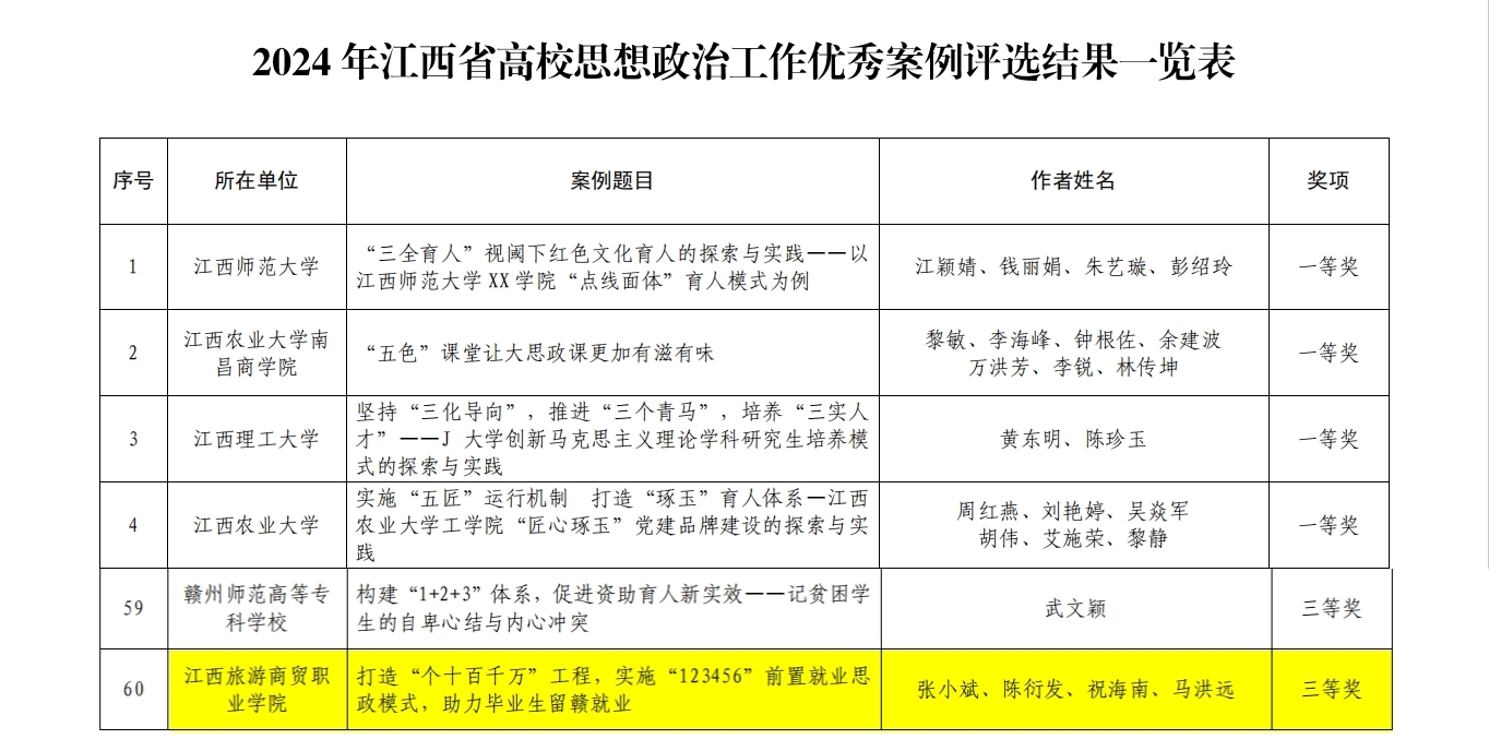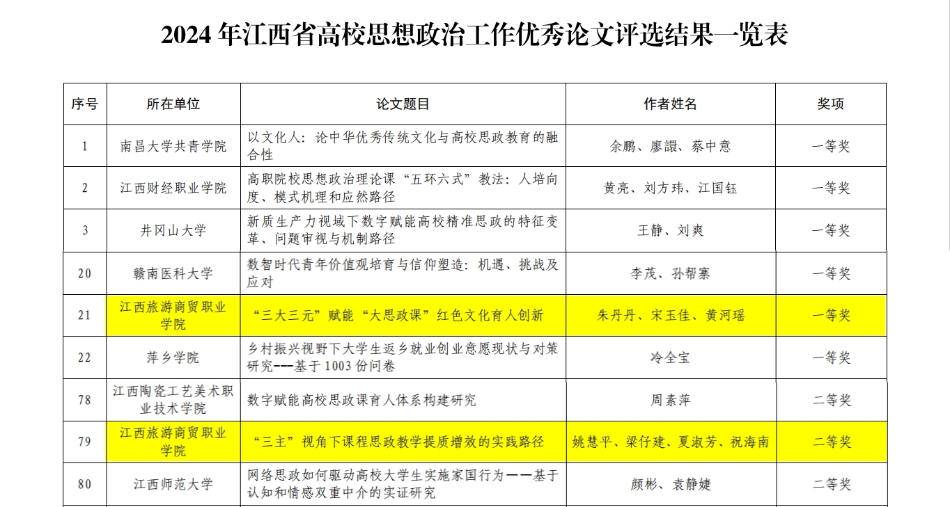 我校教师朱丹丹、宋玉佳、黄河瑶撰写的论文《“三大三元”赋能“大思政课”红色文化育人创新》荣获2024年度全省高校思想政治工作优秀论文一等奖;姚慧平、梁仔建、夏淑芳、祝海南撰写的论文《“三主”视角下课程思政教学提质增效的实践路径》荣获2024年度全省高校思想政治工作优秀论文二等奖;张小斌、陈衍发、祝海南、马洪远撰写的案例《打造“个十百千万”工程,实施“123456”前置就业思政模式,助力毕业生留赣就业》获2024年度全省高校思想政治工作优秀案例三等奖。