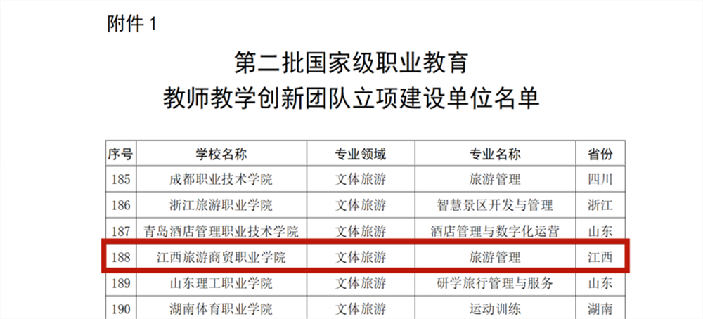 7月26日,教育部发布了《教育部教师工作司关于遴选第二批国家级职业教育教师教学创新团队遴选结果的公示》。经自主申报、省级教育行政部门和全国行业职业教育教学指导委员会审核推荐、项目秘书处形式审查、专家会议评审,我校旅游管理专业教学团队成功入选第二批国家级职业教育教师教学创新团队立项建设单位,这是我校在国家级职业教育教师教学创新团队建设过程中取得的又一重大成果,体现了学校教学团队扎实的教学、科研水平和创新能力。