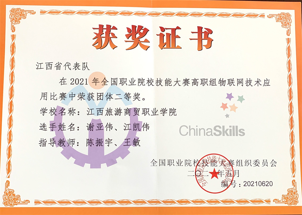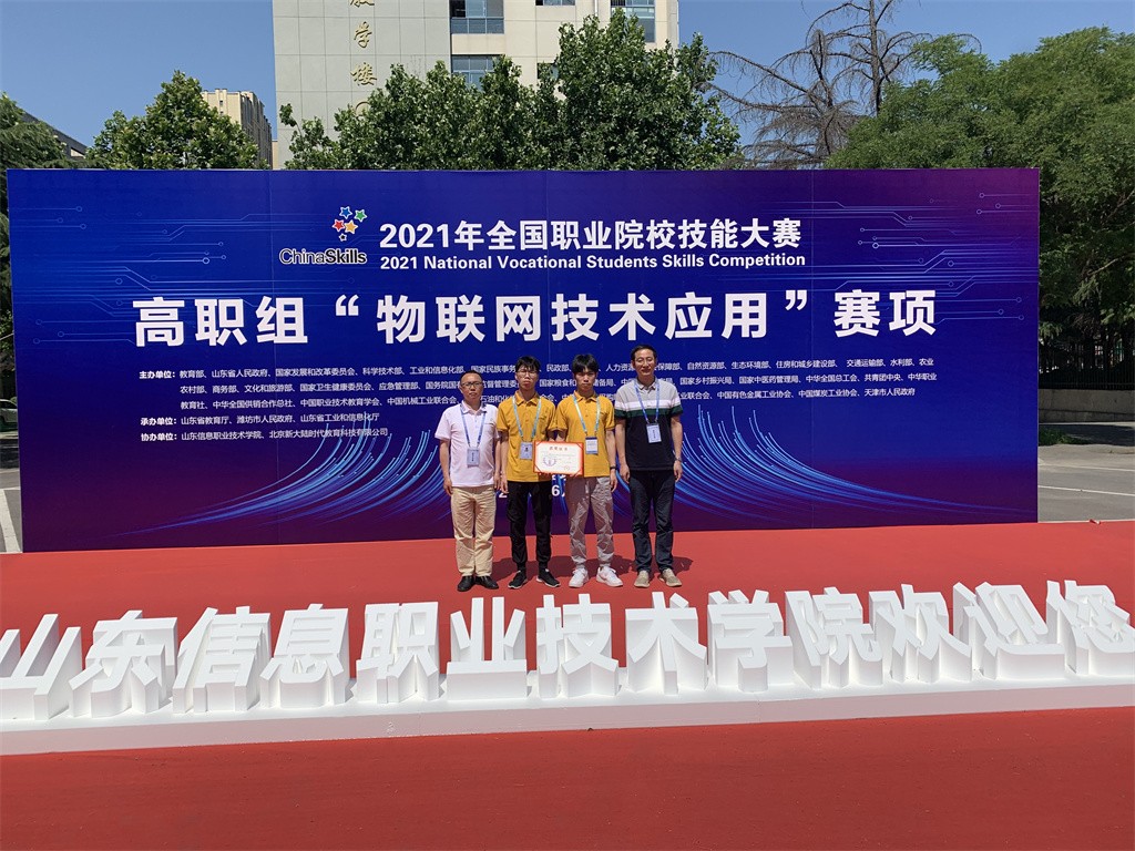 6月4-6日,2021年全国职业院校技能大赛高职组“物联网技术应用赛”全国总决赛在山东潍坊市山东信息职业技术学院开赛。由我校机电与建筑工程学院陈振宇、王敏老师指导的物联网技术应用专业学生谢亚伟、江凯伟代表我省参比赛,荣获二等奖(全国第五名),为我省和学校赢得了荣誉。